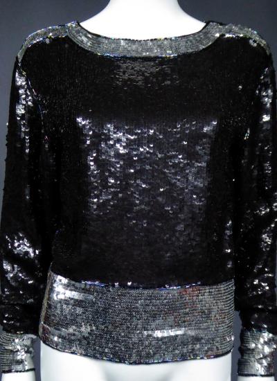 Top entirely embroidered with black and silver sequins by Yves Saint Laurent Rive Gauche dating from the 1984 Collection. Round low-cut neckline, long sleeves and closure with two zips on the sides and snaps on the shoulders. Embroidery in sequins lying in fish scales. Very Music Hall effect thanks to the silver border at the neck, shoulders, wrists and waist, underlined with embroidered iridescent tubular beads. Lining in black rayon. Label white background black graphic Yves Saint Laurent Rive Gauche Paris. Excellent condition of color and conservation.