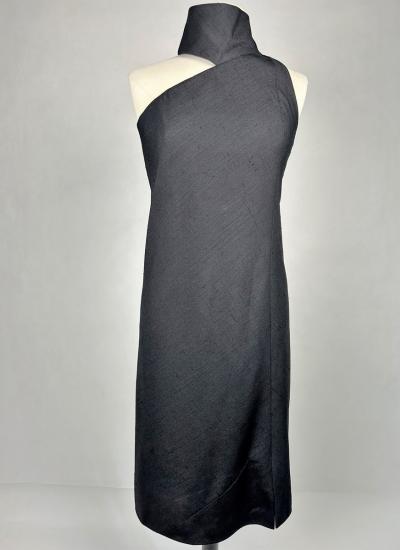 Little black dress or Couture cocktail dress in wild silk fabric by Christian Dior, directed by Marc Bohan. Sleeveless sheath dress with a high Mao-style collar. It is treated asymmetrically, with the fabric on the bias and the zip fastening in line with the right shoulder in the back. Complex, asymmetrical cut with black taffeta under-dress, zipped from the inside and expertly fastened with press studs on the back of the collar. Inner waist belt in black elastic and green catwalk bolduc showing the number 154 at the Hôtel Georges V in 1966, concealed in the slit at the bottom of the dress. The level of construction of this dress and the couture finishes are worthy of the world's greatest haute couture house. Labelled Christian Dior Paris Printemps Eté 1966 numbered 130259. Flawless dress. Very good colour and condition.