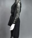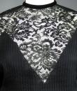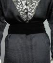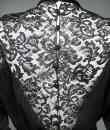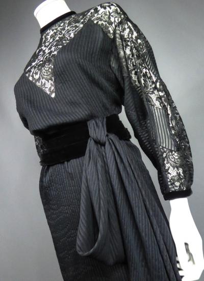 Haute Couture or cocktail little black dress in muslin and Caudry lace from the designer house Christian Dior directed by Marc Bohan. Straight dress with batwing sleeves and interesting pointed cutouts in Caudry lace on the neckline, shoulders and slightly puffed sleeves. Backgounf fabric in shaded and striped muslin and unde-dress in black silk crepe. Elegant fastenings with matching buttons on the back closing the round collar lined with velvet. Velvet belt with hooks on one side, decorated with a draped braid to tie. The level of construction of this dress and the Couture finishes are worthy of the largest fashion designer house in the world. Label white background black graphics Christian Dior Paris Printemps Eté 1982 Made in France numbered 15843. Flawless dress. Excellent condition of color and conservation.