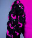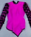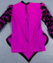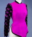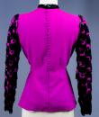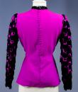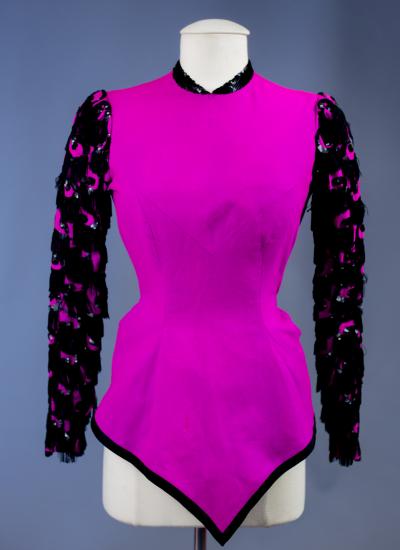 Amazing evening bolero, possibly Haute Couture Worth (oral transmission of the progeny), made of fuschia wool twill Circa 1938/1942. Curved bolero with scabbard marking the hips, with diagonal cut in diamonds. Officer collar and long sleeves densely embroidered with black silk fringes and paillons, with baroque and hispanic design. Pointed front leg highlighted by a black wool bias and closing in the back with bells buttons covered in the same (one button missing), snap fasteners buttons on the wrists. Unlined, collector’s piece with a few holes of moths. Good structural condition.