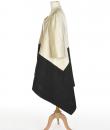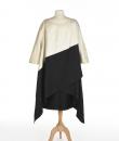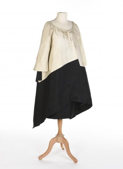 Rare grand soir ensemble, dress and cape coat in champagne and black silk shantung designed by Hubert de Givenchy Haute Couture dating from the 1960s. Sheath dress with plunging neckline and cream silk shantung. Matching Chasuble coat with black and white two-tone colour scheme, straight three-quarter length sleeves and boat neckline with gimped front. Judicious work on the back with two obliquely crossed panels. Black and white woven satin Givenchy Paris label on the coat. Hook and eye at the armpits of the dress and halos in the lining of the coat. A weakness in the front of the coat and very rare and localized rust spots. Collector's item. Good structural condition of colour and conservation.