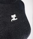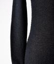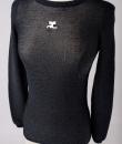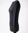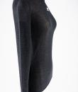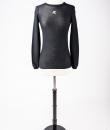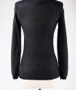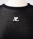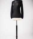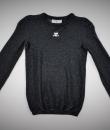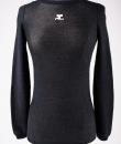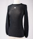 Beautiful black stretch jumper in polyamide wool knit and silver lurex lamé from the House of Courrèges, dating from the late 1970s. It has a tight fit, crew neck, long sleeves and the House logo in applied white silk. The label indicates Courrèges Paris size B. Note very few threads pulled but not serious, otherwise no defects. Very good condition of colours and conservation.