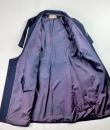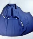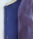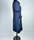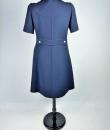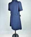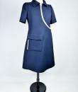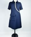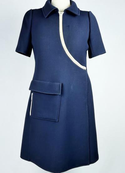 Haute couture wrap dress number 85726 (?) in thick navy blue jersey dating from the 1970s. Flared dress in a chasuble cut with topstitching, short sleeves and a Claudine collar with folded panels. Asymmetrical double-breasted dress with large white plastic zip highlighting the bust and large pocket with side flap, and press studs. Matching navy blue nylon lining and label indicating Courrèges Paris Made in France C, illegible number 85726 (?) (gaps in label). There is a small repair on the chest, micro soiling and a very slight patina. Dress with stable fabric and no other defects. Good overall structural condition. Price accordingly.