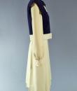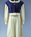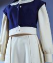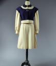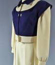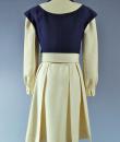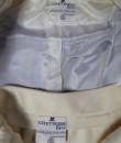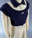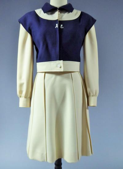 Tailors jacket and skirt Couture André Courrèges dating from the end of the 1960s. Size A sewing Future. Cream cream and Navy wool Twill, acetate lining. Short "futuristic" bib navy jacket, Zip plastic leg size to pressure and white vinyl AC acronym button. Broken white plastic round buttons. Wise skirt pleats and belt to snap. Excellent condition (two micro halos to a handshake and a shot a round wire).