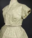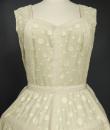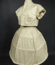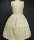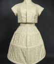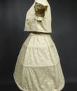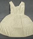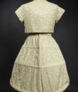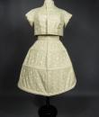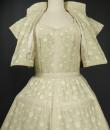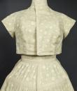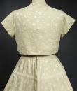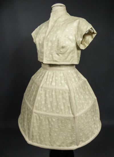 Amazing Baby Doll style set including a hoop dress, a Bermuda shorts and a bolero from the Couture designer house Andrée Vizir in Lyon and dating from the 1970s. From the wardrobe of Ms. Augier, owner of the Negresco Palace in Nice on the Côte d 'Azur. Shaped and elastic silk jersey in cream “ficelle” color and with a drawing of small Pop Art circles with fluffy contours. Fun integrated hoop cage type short crinoline entirely lined with cream cotton trimmings. Bermuda shorts can be worn separately with the bolero or under the dress. Set said “à transformation” for the different moments of the day as in the 19th century! Very clean, little worn, little or no trace of use. Excellent condition of color and conservation.
