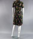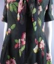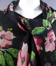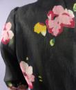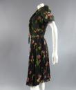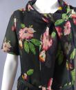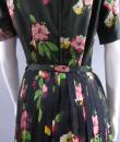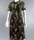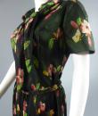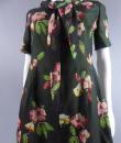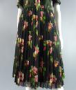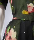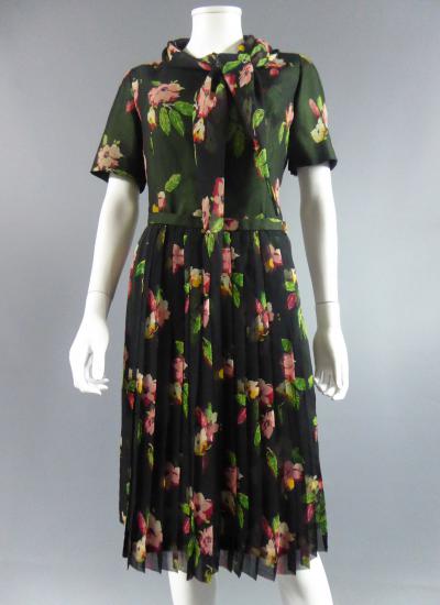 Short sleeves and midi skirt dress, high-quality garment, chiffon flowers on green background. Scarf neck can be tied. Fine pleated skirt, in the same fabric, to be added on the dress in the manner of an apron, closing by snaps. Very good condition.