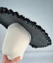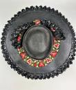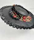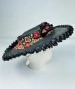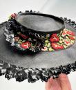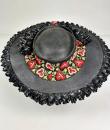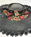A stunning wide-brimmed black straw hat from the 1950s. It is trimmed with lustrous black plaited straw around the edge, with a large matching braid on the front of the cap. Black tulle soutache embroidered with green, red and pink wool and silk forming a garland of flowers. Black elastic, headband behind the bun and black grosgrain soutache in the cap (soutache soiled). No label, but it bears the words France and Collection d'Aumale, a famous French noble family. No defects to note apart from a very slight natural patina due to its age. Good structural condition of colour and conservation.