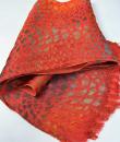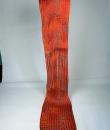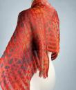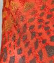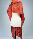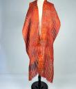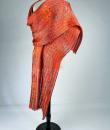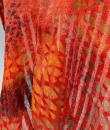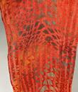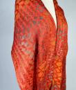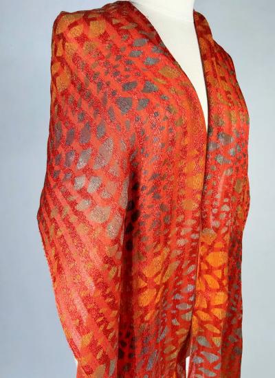 Long Art Deco period scarf in orange raffia and linen dating from the 1920s. Hard-primed scarf woven with strips of raffia and strips of linen overprinted with a stencil. An amazing diamond pattern imitating snakeskin in silver, gold, yellow ochre and grey! Scarf with selvedges on both sides and small fringes of raffia at both ends. Small printing defect at one end with a darker area, which remains proof of the artist's handiwork. Beautiful matt glossy contrast effect. Good condition and portable today.