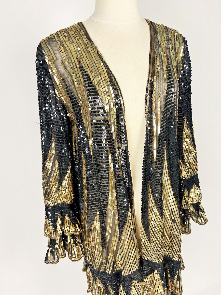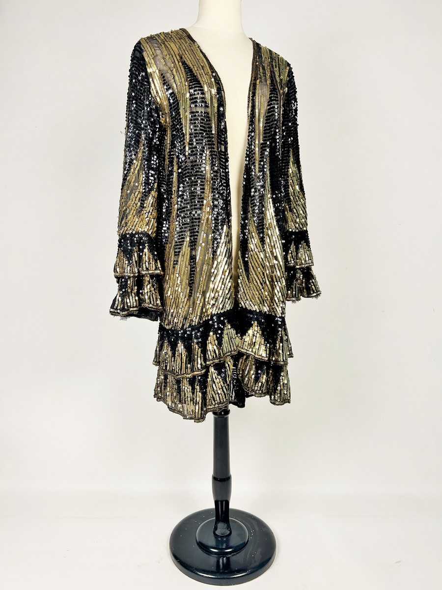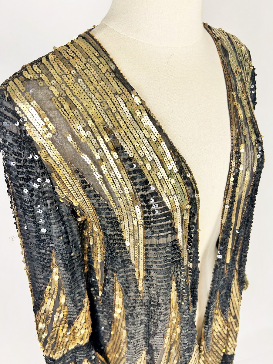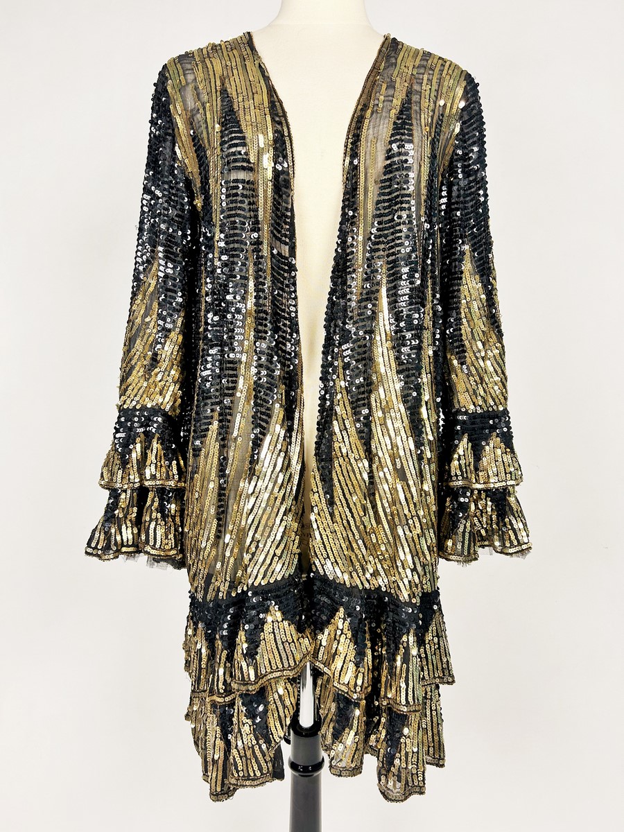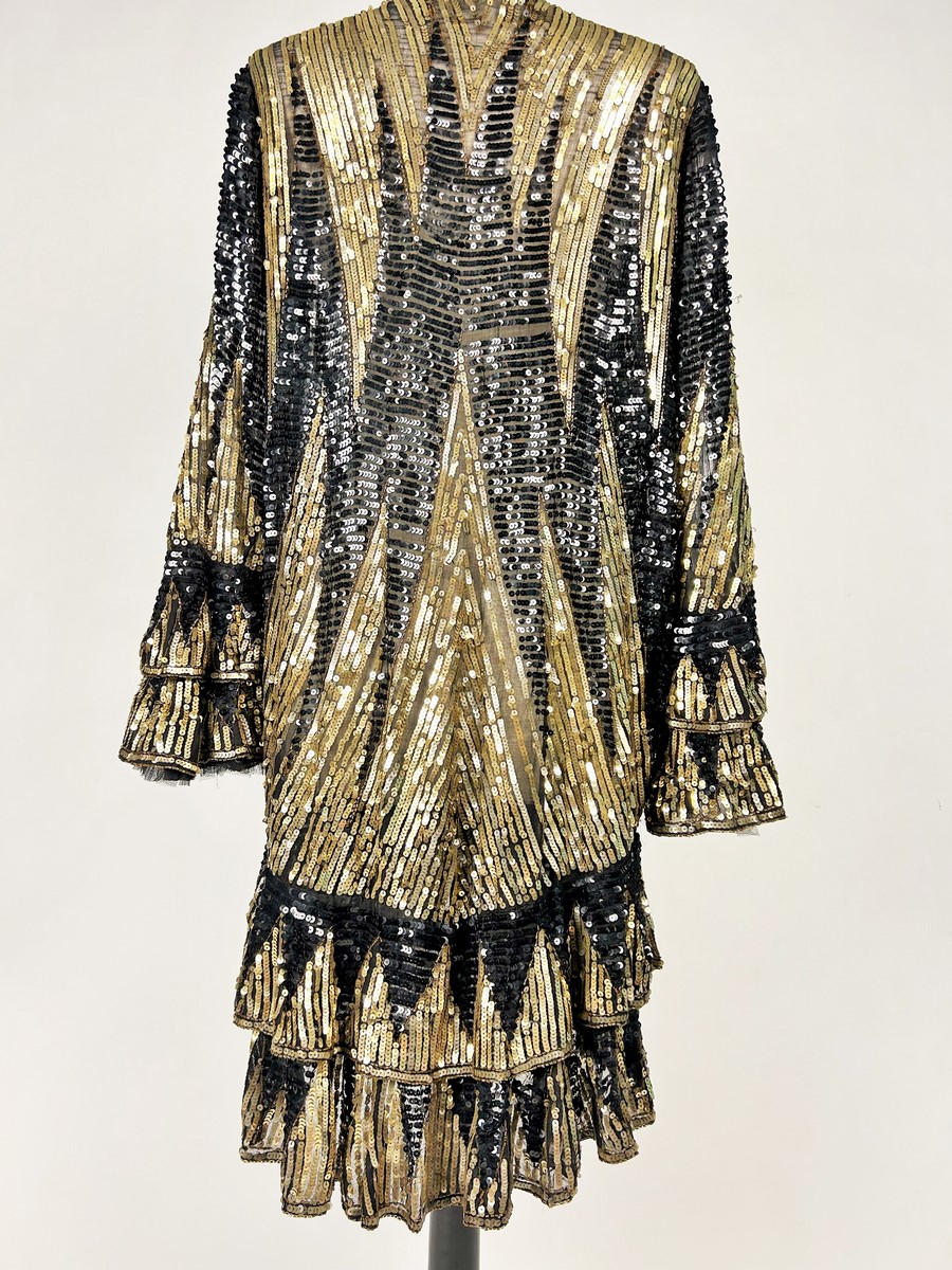 Evening coat with sequins, unidentified haute couture, entirely embroidered with gold metallic sequins and black celluloid sequins, dating from the Art Deco period in France. Mid-length coat with long sleeves and double pagoda-shaped ruffles at the cuffs, repeated at the bottom of the coat. Sequins embroidered diagonally and vertically on a cotton voile background, creating a two-tone gold and black effect. Geometric designs with long pyramidal triangles, typical of decorative art in France between 1925 and 1930. Unlined and without a designer label. A few rows of sequins are missing, which are only noticeable upon close inspection, as the glittering and sparkling effect largely takes over. The cotton voile lining is very strong and durable, with no holes or stains. Good overall structural condition. Wear it or collect it!