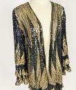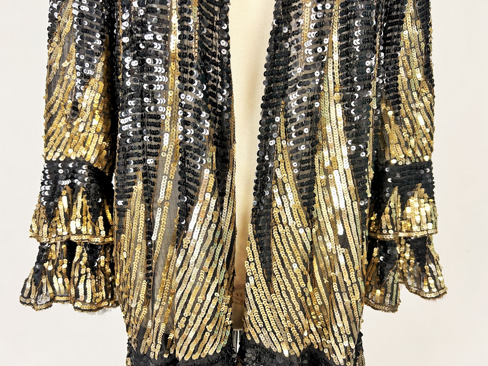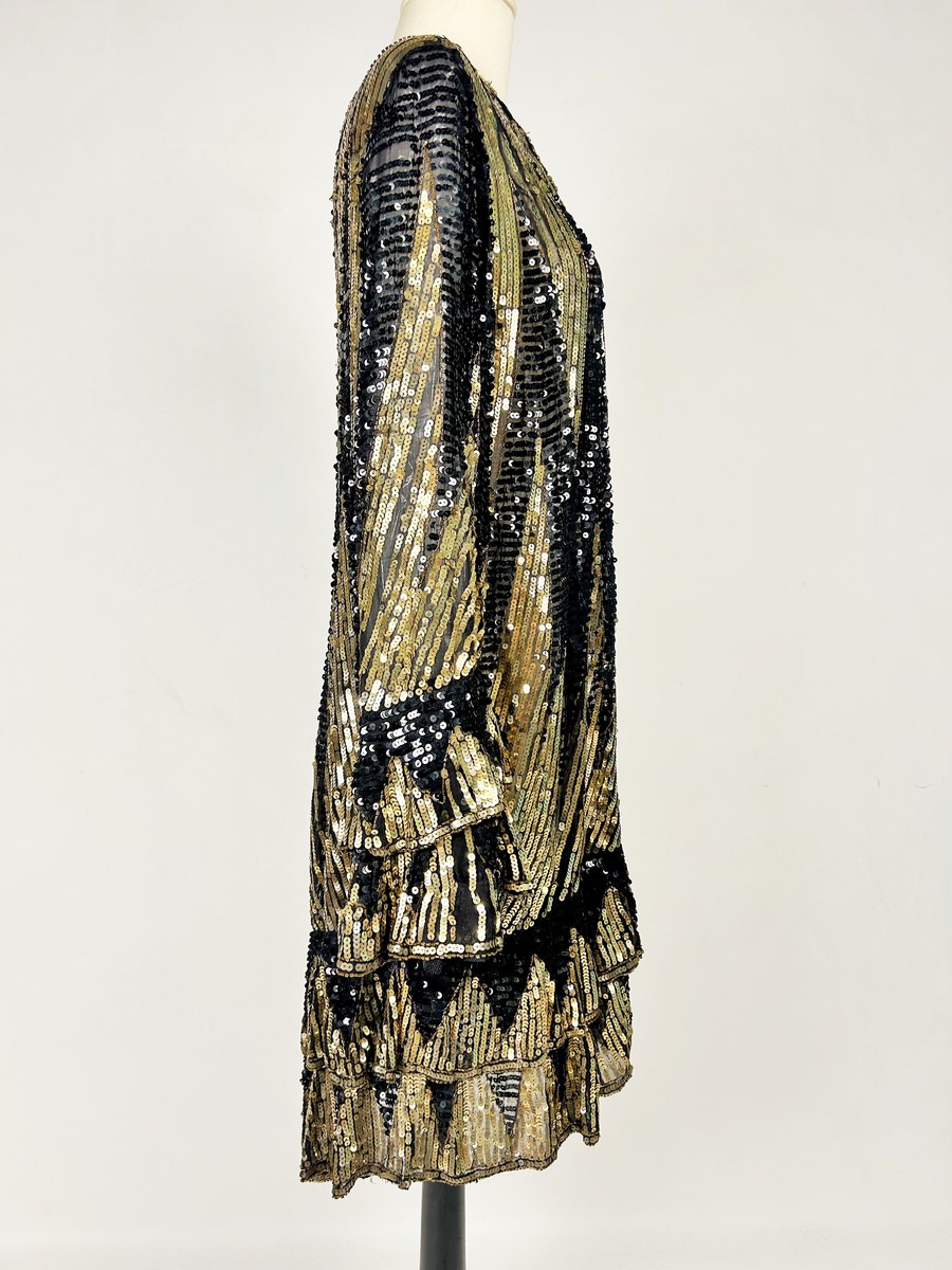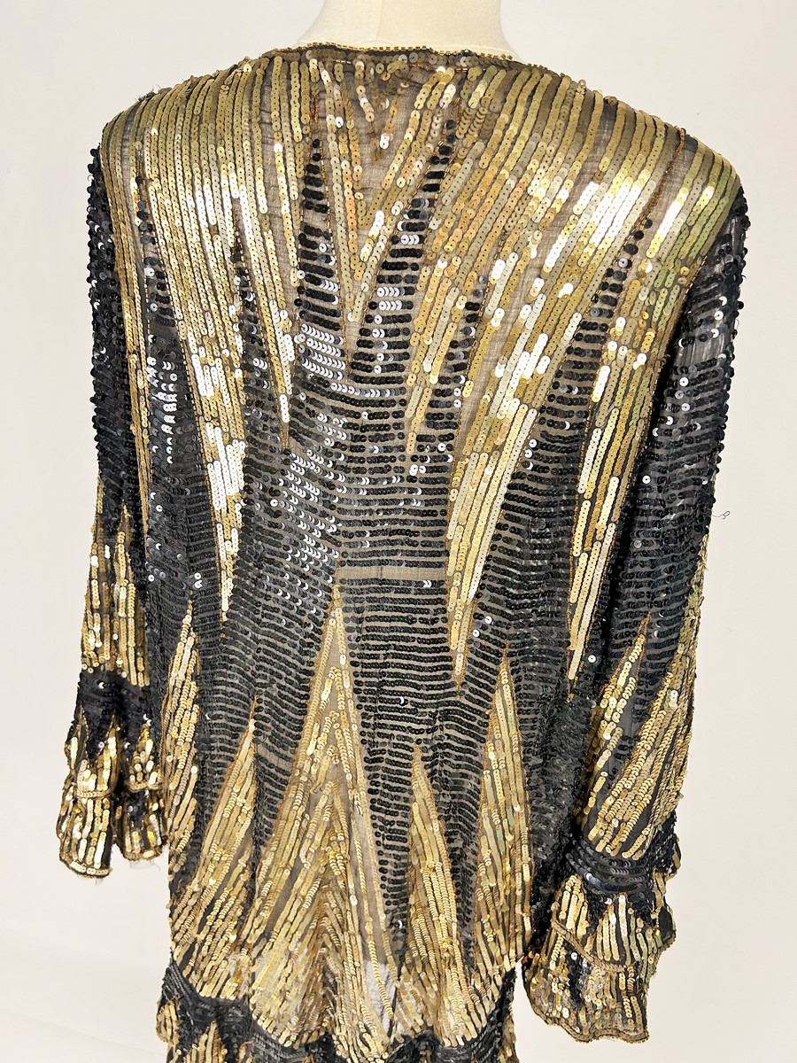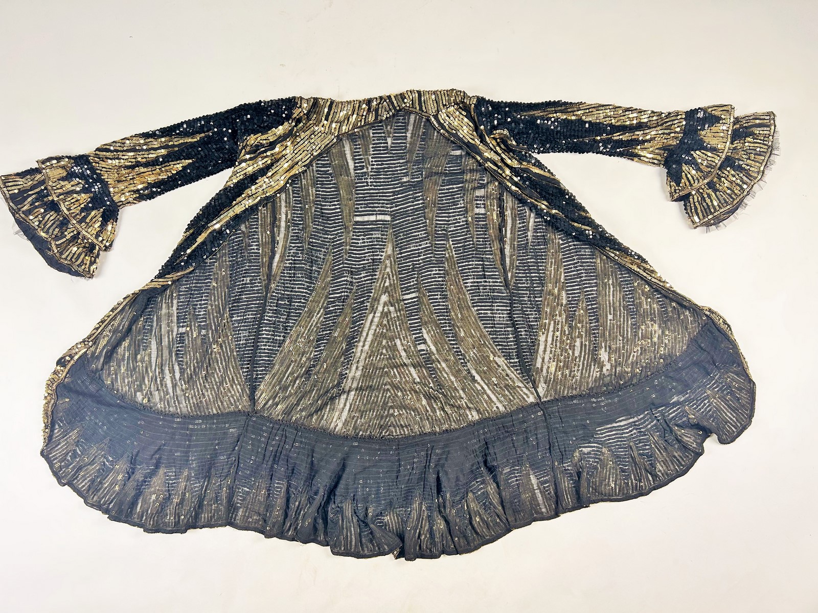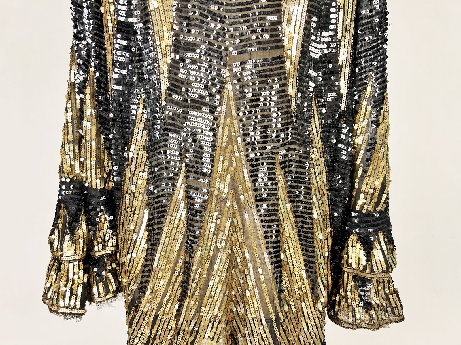 Evening coat with sequins, unidentified haute couture, entirely embroidered with gold metallic sequins and black celluloid sequins, dating from the Art Deco period in France. Mid-length coat with long sleeves and double pagoda-shaped ruffles at the cuffs, repeated at the bottom of the coat. Sequins embroidered diagonally and vertically on a cotton voile background, creating a two-tone gold and black effect. Geometric designs with long pyramidal triangles, typical of decorative art in France between 1925 and 1930. Unlined and without a designer label. A few rows of sequins are missing, which are only noticeable upon close inspection, as the glittering and sparkling effect largely takes over. The cotton voile lining is very strong and durable, with no holes or stains. Good overall structural condition. Wear it or collect it!