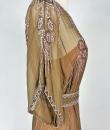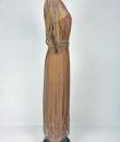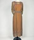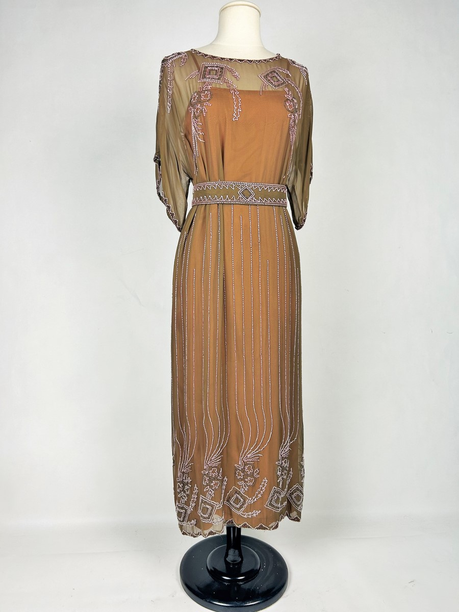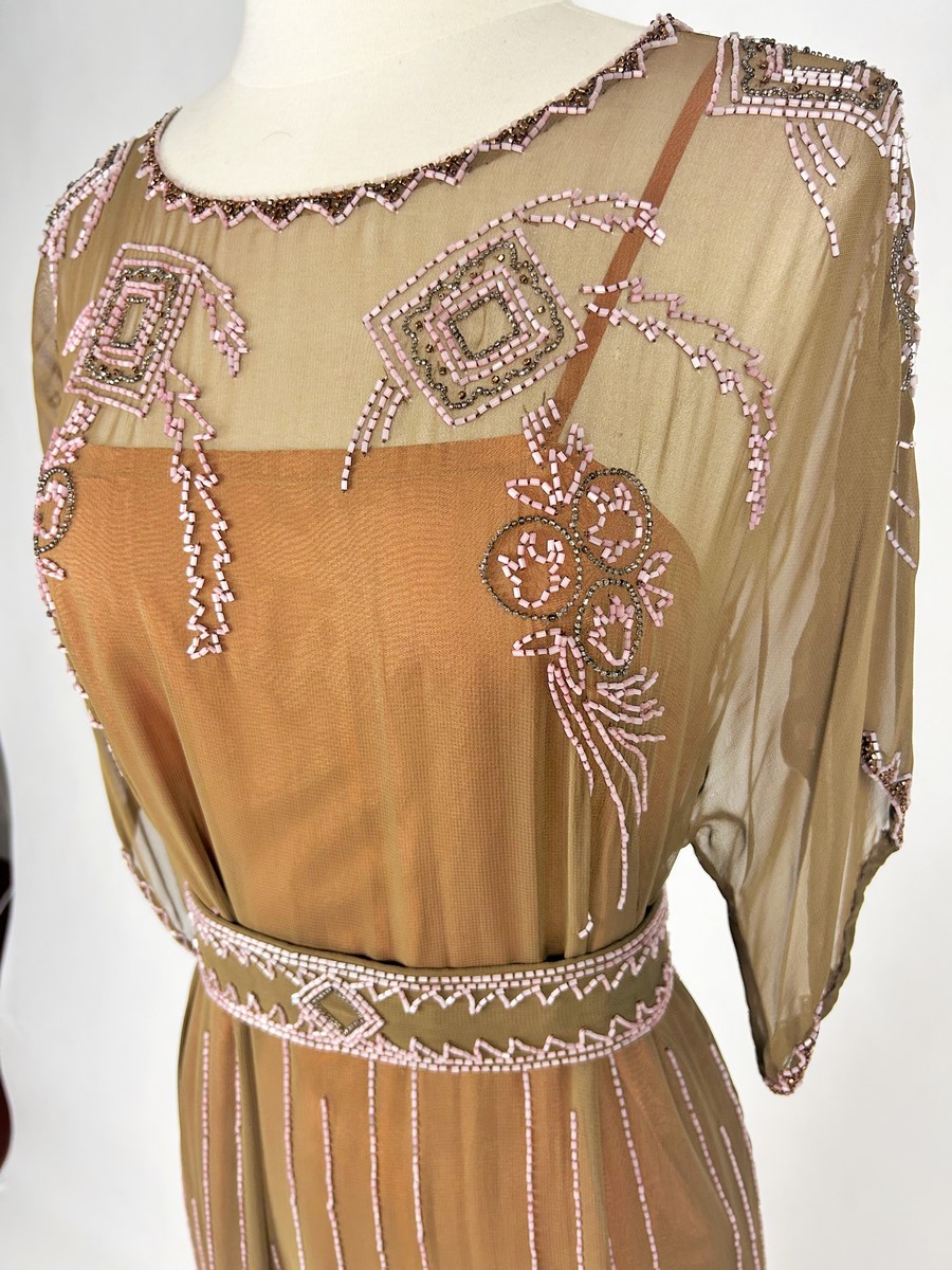 Elegant evening gown in buff-colored silk crepe muslin embroidered with pearls, dating from the early Art Deco period in France. Loose, straight sack cut, boat neckline and kimono sleeves, entirely embroidered with pink and white tubular glass beads and translucent glass beads. Languid floral design with geometric cartouches, highlighting the collar, sleeves, and bottom of the dress. The underdress with thin straps is made of nylon taffeta, zips up on one side, and is a later period. Its rusty orange color creates a subtle transparency effect under the buff-colored muslin. This transparency enhances the pastel colors of the bead embroidery. A matching belt, embroidered in the same style, allows the dress to be gathered at the waist. Note that a few rows of beads are missing, which is only noticeable upon close inspection, the only flaw to report. The muslin background is stable, with no stains or holes. Good overall condition in terms of color and preservation. Dress to wear or collect.