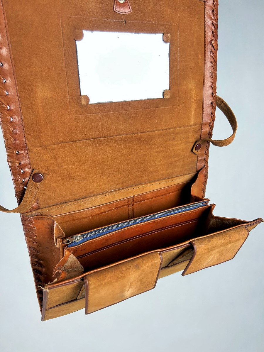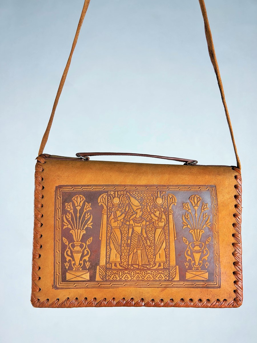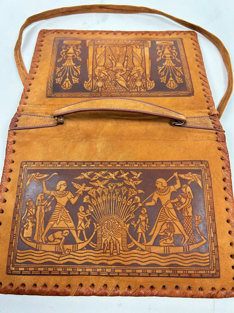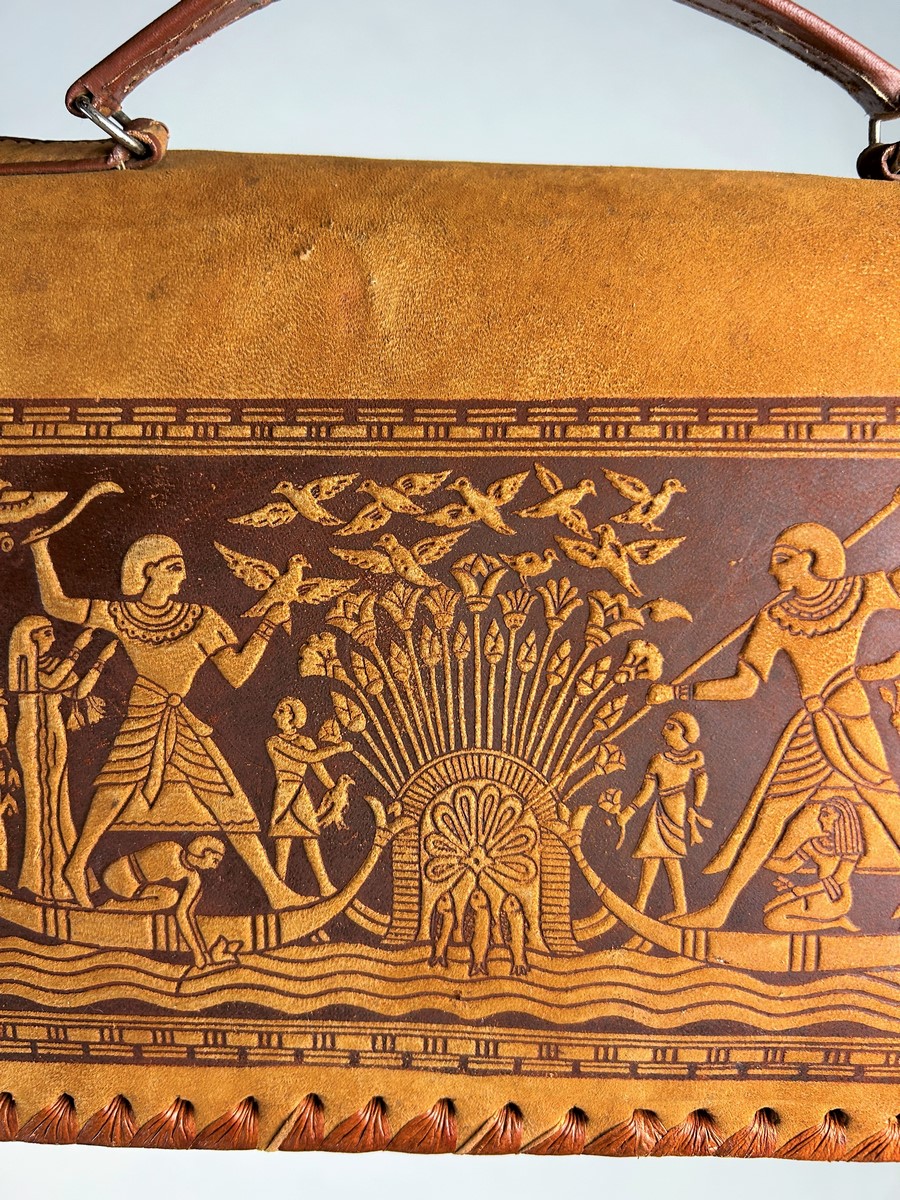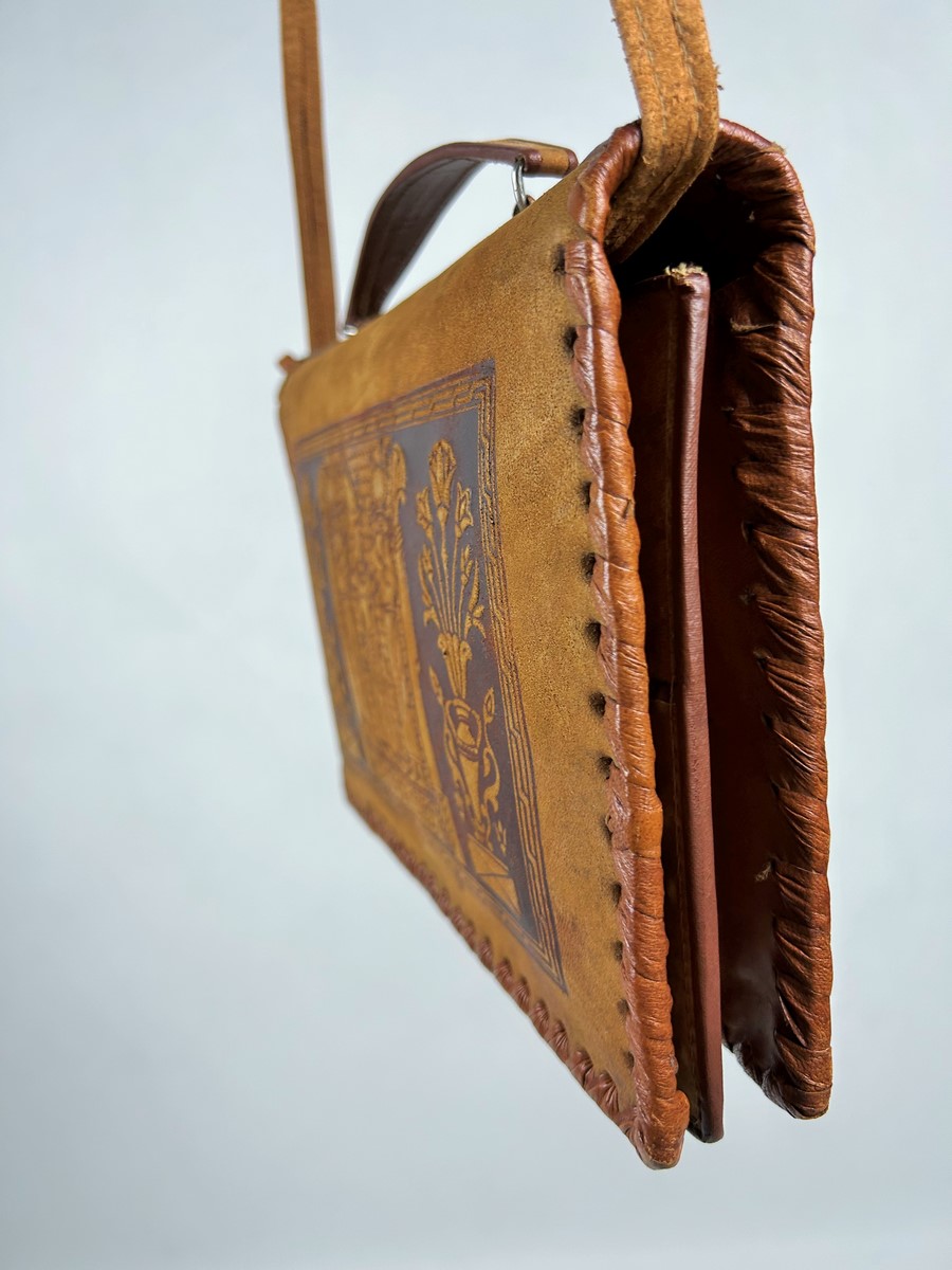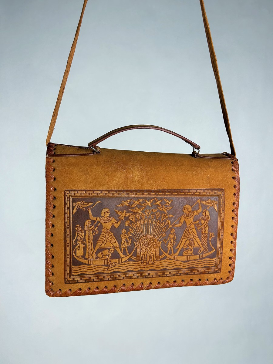 Suede leather bag in the Egyptomania style that emerged after the discovery of Tutankhamun in Egypt in 1922. This unprecedented movement made Egypt fashionable in the 1920s in several areas of decorative arts, including fashion. Bag with small handle, strap and three gusseted compartments, one of which has a zip. Interior mirror for make-up and large flap closed with a press stud. Beautiful engraving on dark brown dyed leather, featuring pharaohs, goddesses and flowered basins on both sides of the bag. The edges are perforated and laced with matching softer leather. No major flaws apart from tiny scratches and small marks that are very difficult to see. The edges are not chipped. Very slight patina from age. Good overall condition. Rare item.