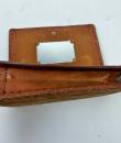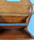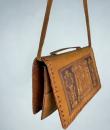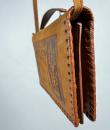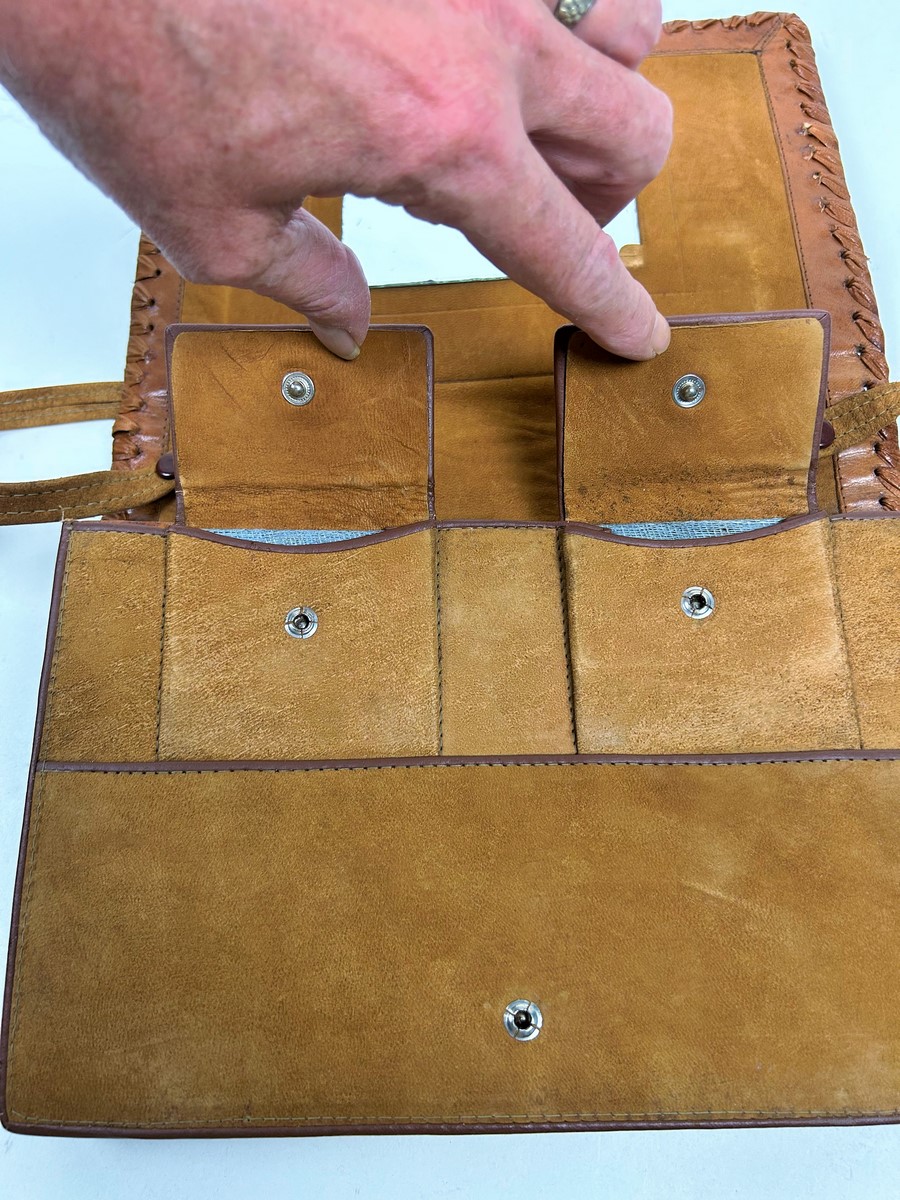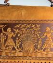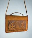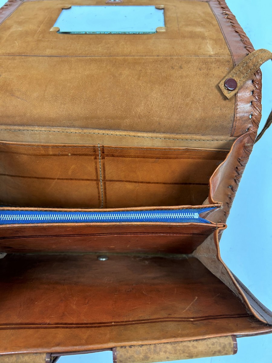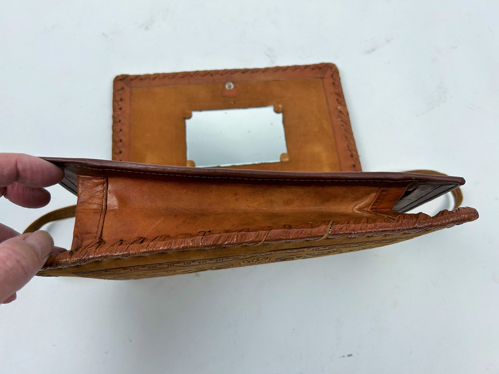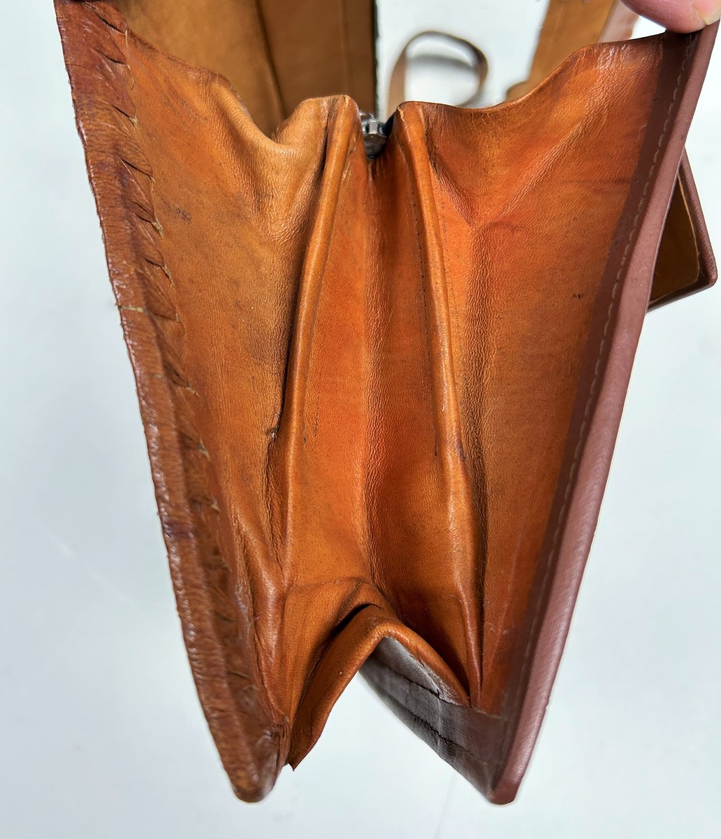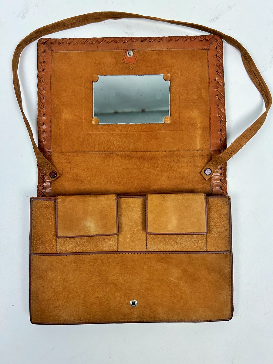 Suede leather bag in the Egyptomania style that emerged after the discovery of Tutankhamun in Egypt in 1922. This unprecedented movement made Egypt fashionable in the 1920s in several areas of decorative arts, including fashion. Bag with small handle, strap and three gusseted compartments, one of which has a zip. Interior mirror for make-up and large flap closed with a press stud. Beautiful engraving on dark brown dyed leather, featuring pharaohs, goddesses and flowered basins on both sides of the bag. The edges are perforated and laced with matching softer leather. No major flaws apart from tiny scratches and small marks that are very difficult to see. The edges are not chipped. Very slight patina from age. Good overall condition. Rare item.