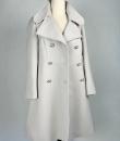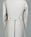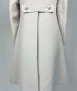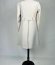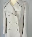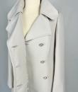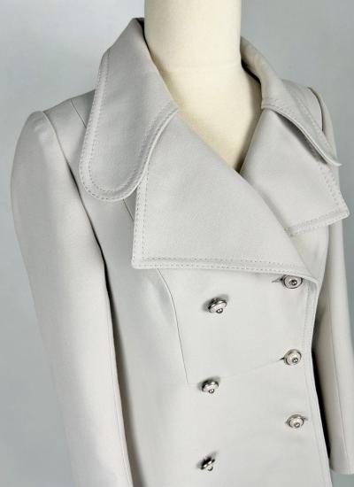 Women's trench coat in mastic-coloured wool Toile, unlabelled and dating from the 1970s or 1980s. Structured cut with yoke on the bust, flared at the bottom, long sleeves, slit at the back and large collar with folded points. Double-breasted front with six polished steel and beige resin buttons, with matching buttons on the back placket. Double topstitching around the edges, typical of this modernist period. Fully lined in mastic-coloured nylon. No visible flaws to report on this coat, which has retained its beautiful finish. No holes or stains. Piece worn little or not at all. Very good colour and condition.