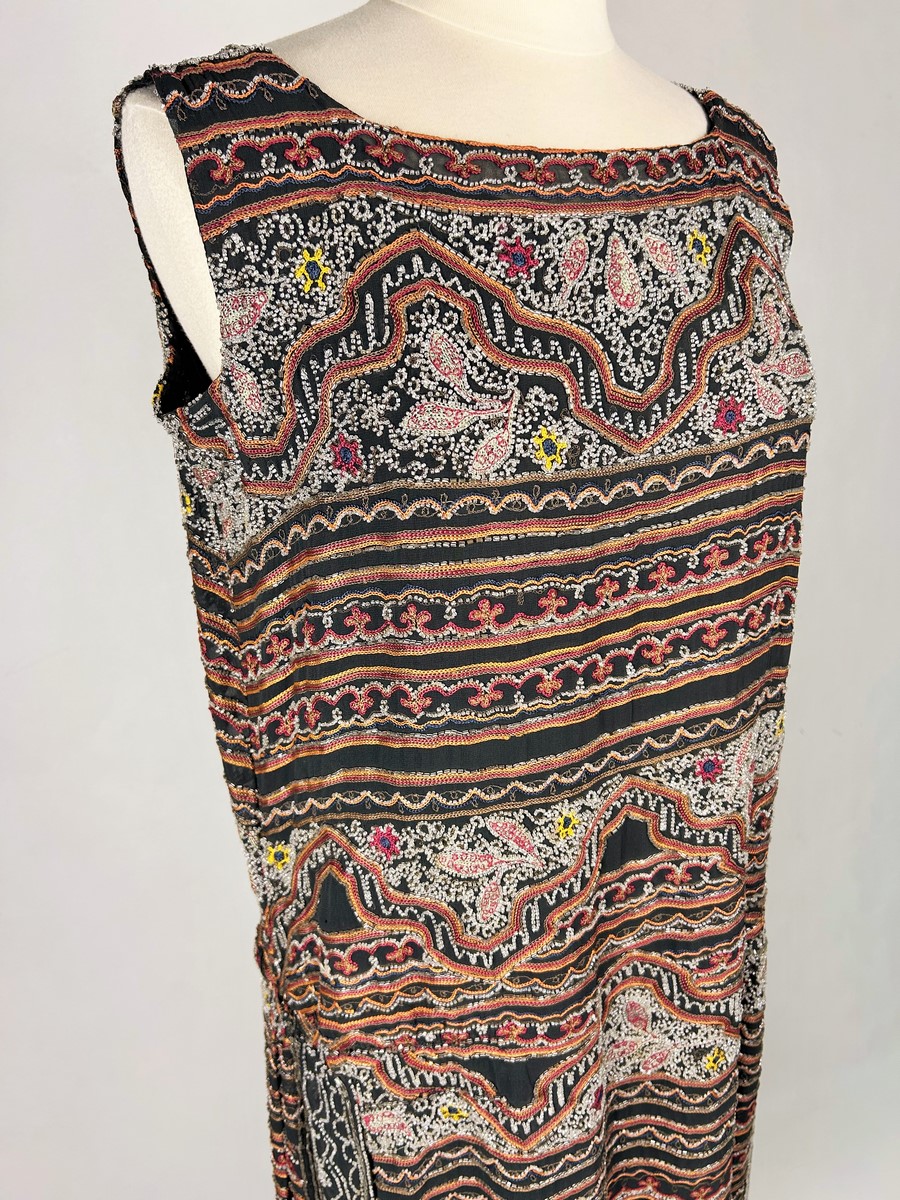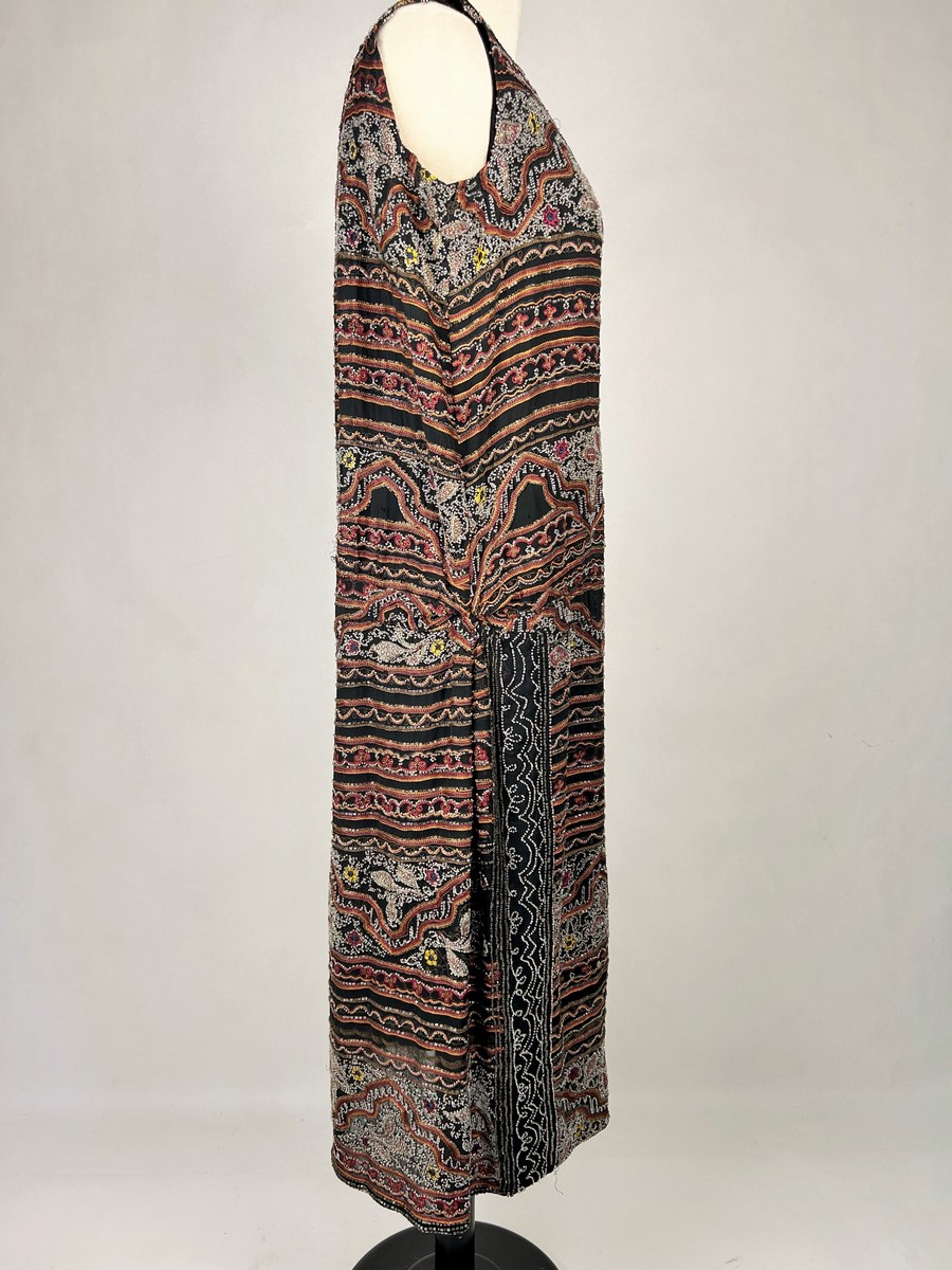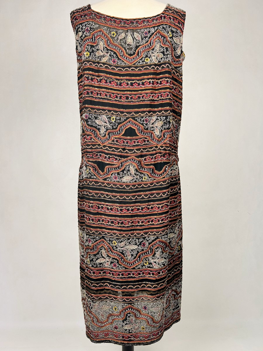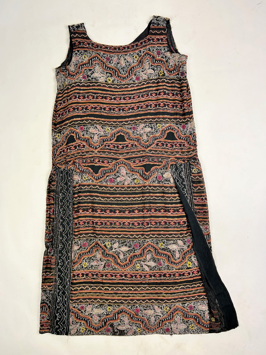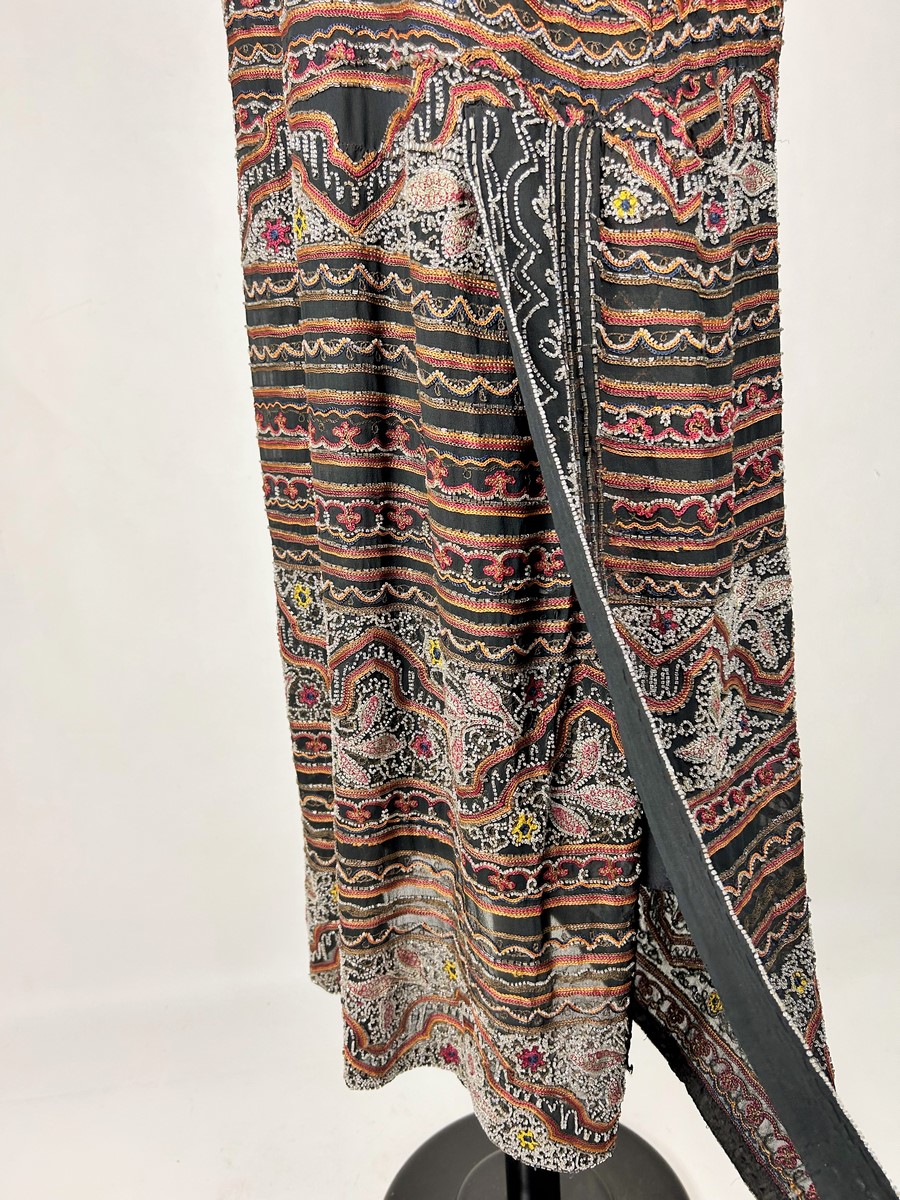 Black silk chiffon ball gown entirely embroidered with translucent glass beads and Cornély embroidery, dating from the french Années Folles. With an embroidered and vermiculated background giving a sandblasted effect, this flowing, straight-cut dress, known as a sack back dress, has a low waist on the hips, is sleeveless and has a square neckline. Black side slits on the sides of the skirt, one of which is split. The design is typically Art Deco and similar to Madeleine Vionnet's creations from the same period. The design is inspired by ethnic fashion and Egyptomania, which were in vogue during the 1920s. The original underdress is made of black crepe satin and the label is missing. The Cornely embroidery uses orange, red, grey and black silk threads as well as gold thread. No holes or stains, the chiffon base is in very good condition. Overall colour and condition are good. A dress to wear or collect!