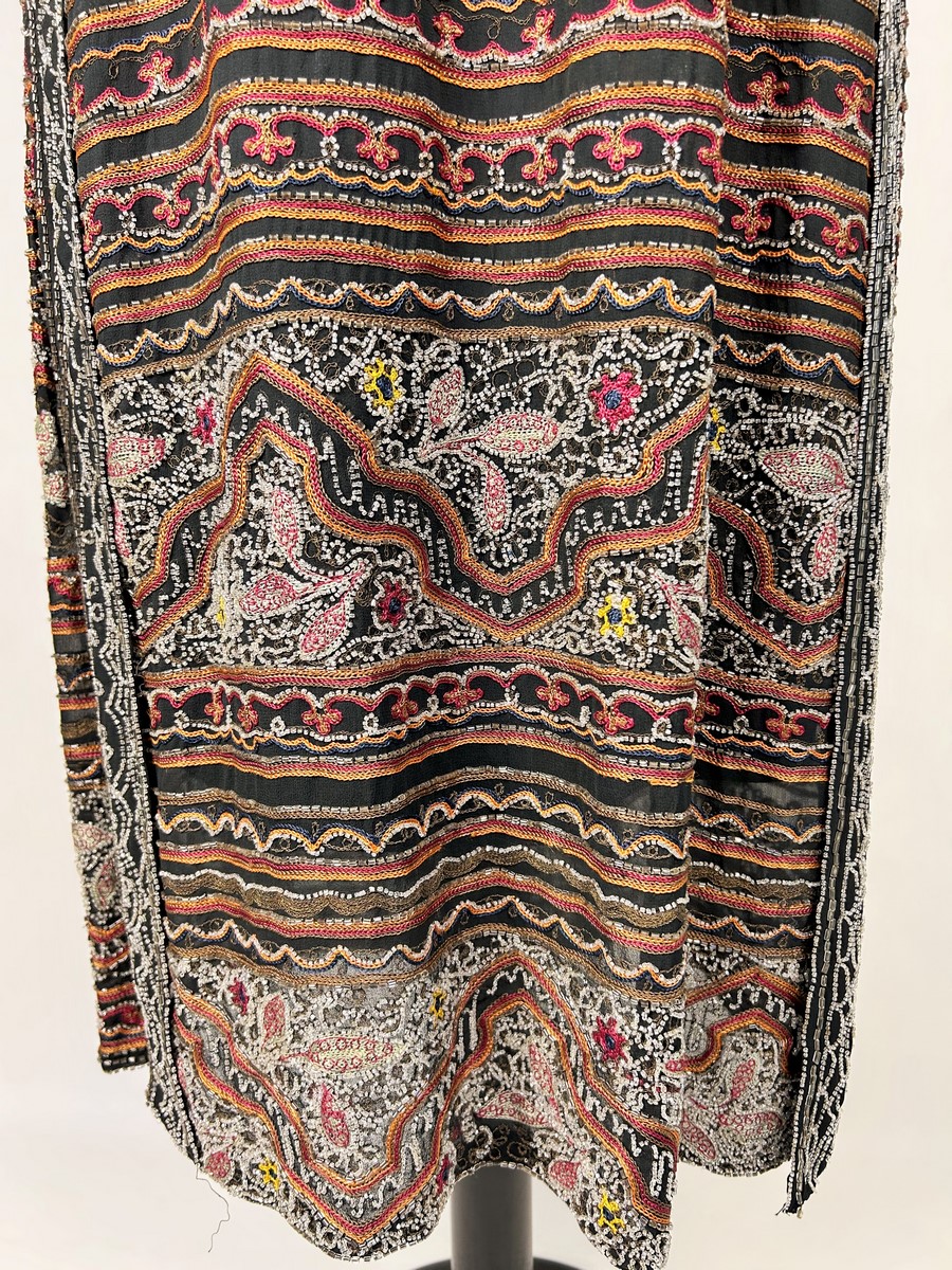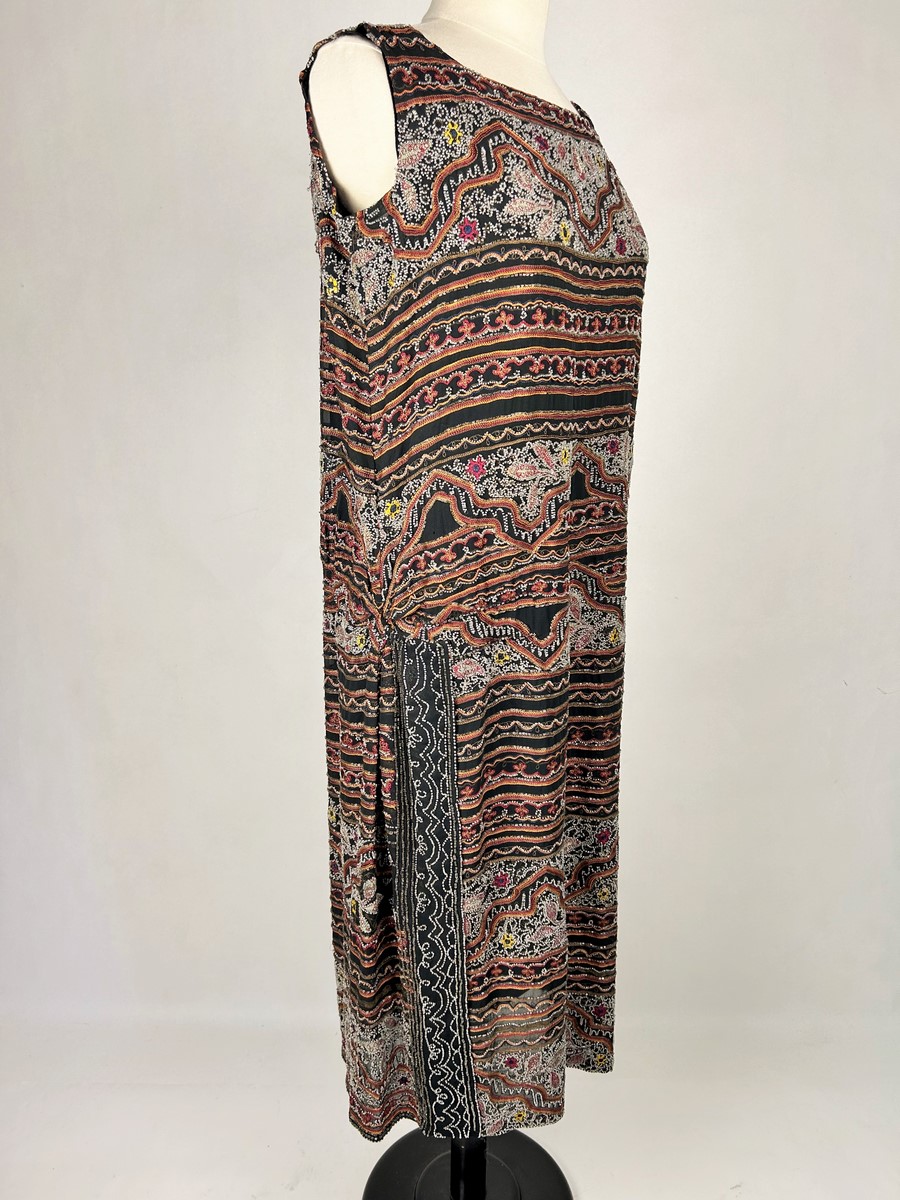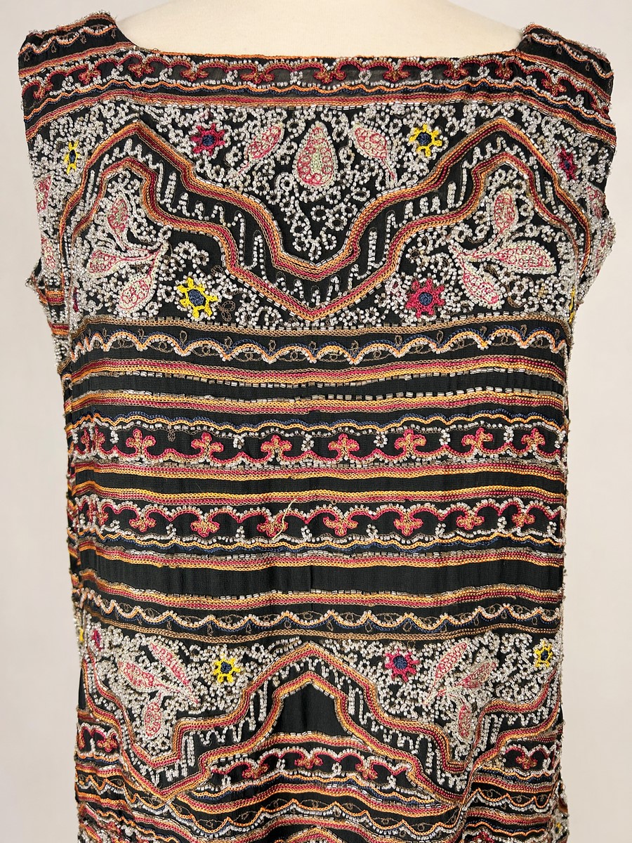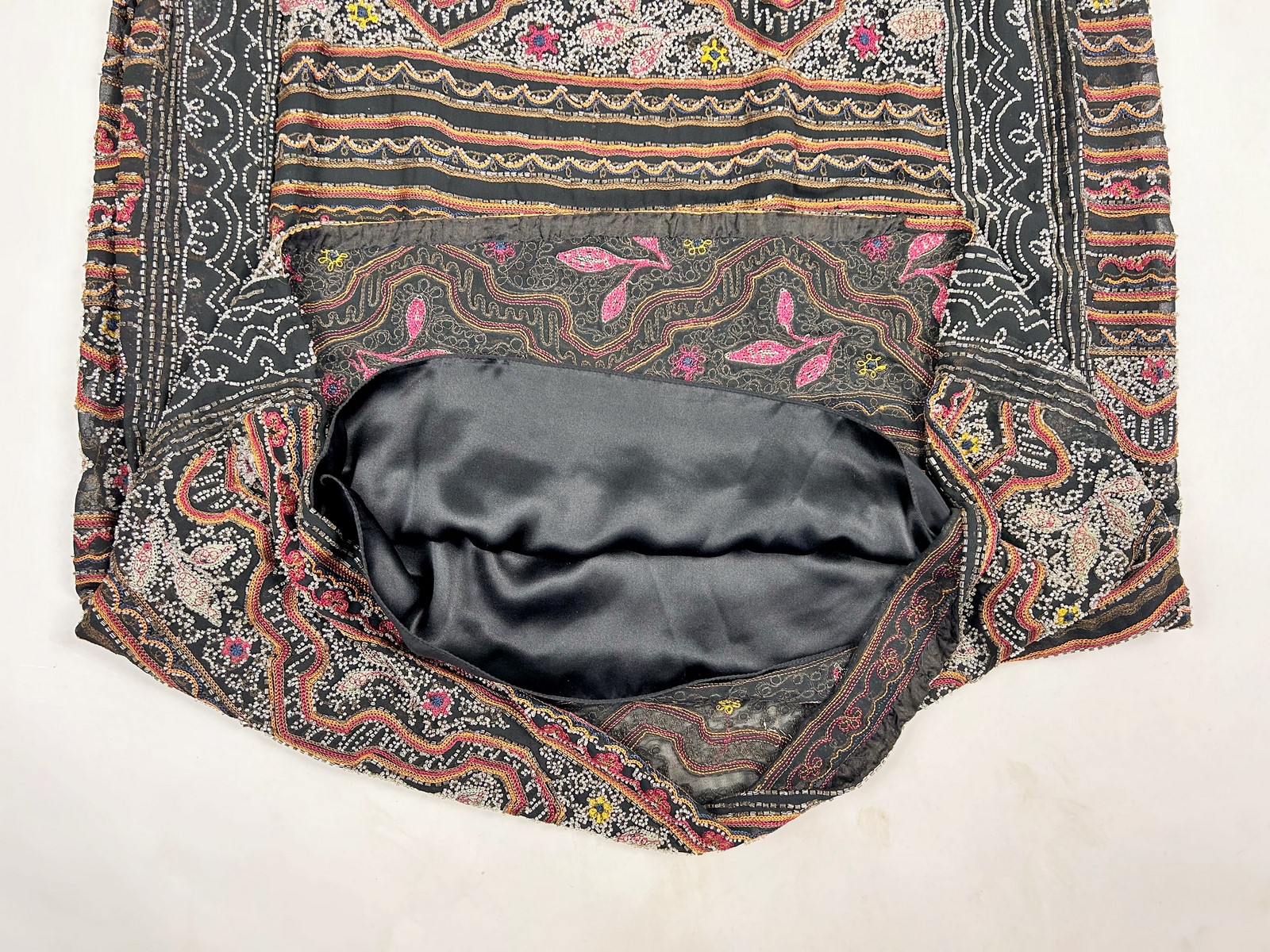 Black silk chiffon ball gown entirely embroidered with translucent glass beads and Cornély embroidery, dating from the french Années Folles. With an embroidered and vermiculated background giving a sandblasted effect, this flowing, straight-cut dress, known as a sack back dress, has a low waist on the hips, is sleeveless and has a square neckline. Black side slits on the sides of the skirt, one of which is split. The design is typically Art Deco and similar to Madeleine Vionnet's creations from the same period. The design is inspired by ethnic fashion and Egyptomania, which were in vogue during the 1920s. The original underdress is made of black crepe satin and the label is missing. The Cornely embroidery uses orange, red, grey and black silk threads as well as gold thread. No holes or stains, the chiffon base is in very good condition. Overall colour and condition are good. A dress to wear or collect!