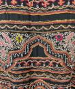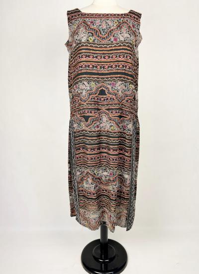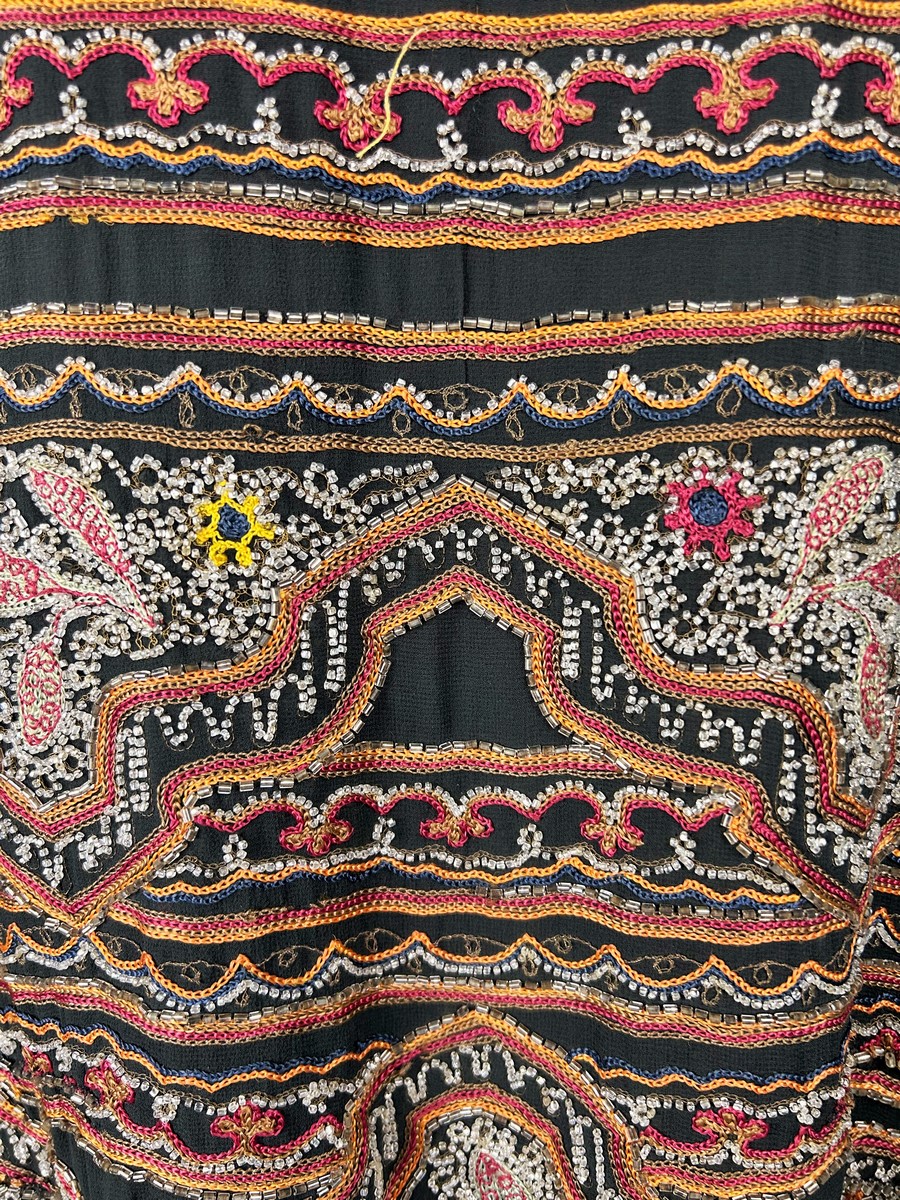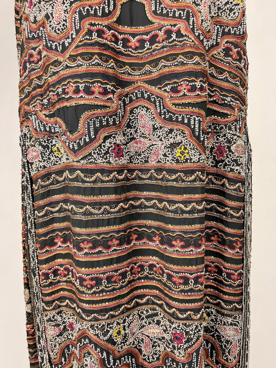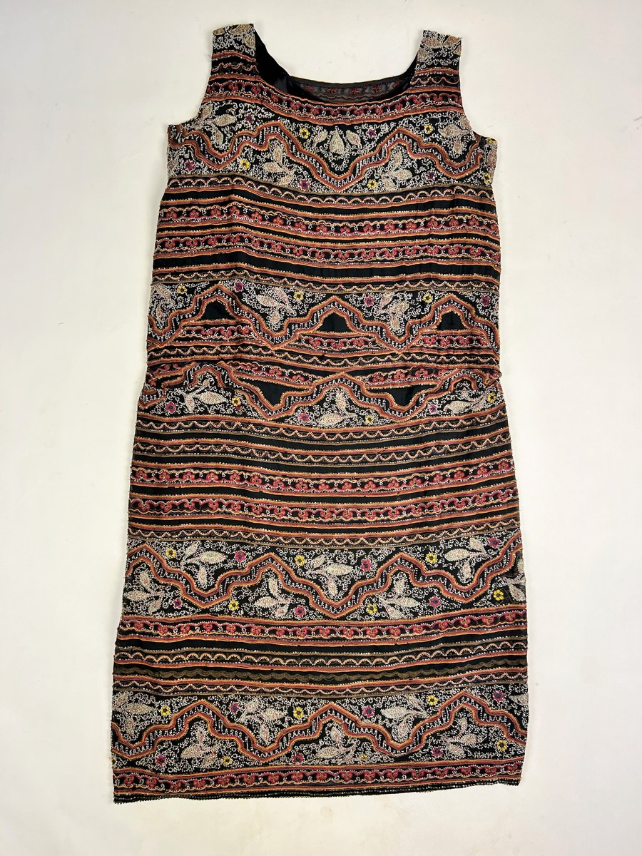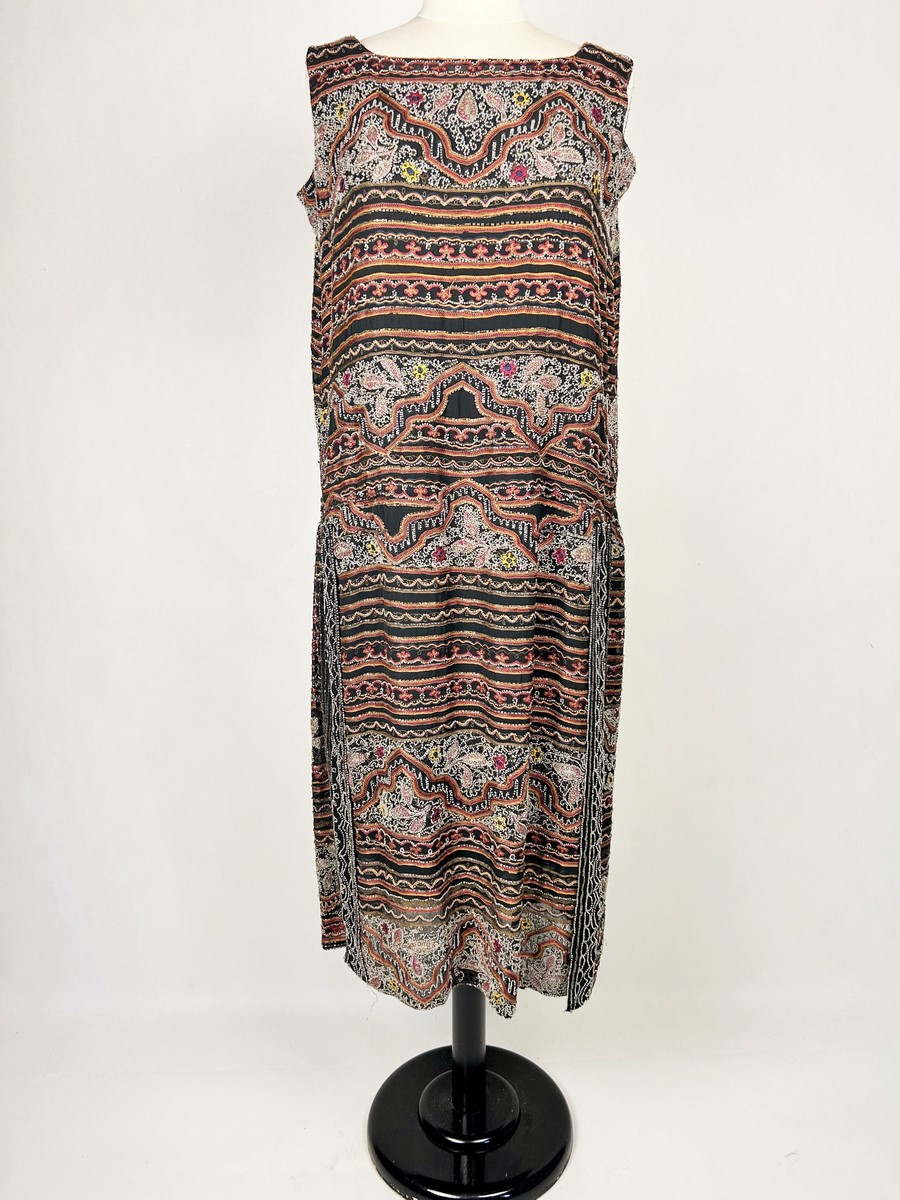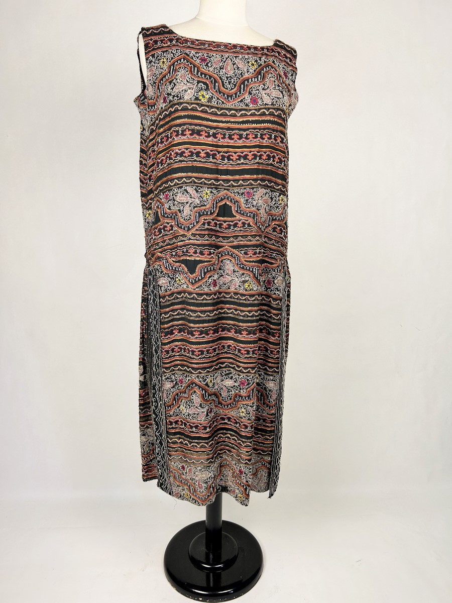 Black silk chiffon ball gown entirely embroidered with translucent glass beads and Cornély embroidery, dating from the french Années Folles. With an embroidered and vermiculated background giving a sandblasted effect, this flowing, straight-cut dress, known as a sack back dress, has a low waist on the hips, is sleeveless and has a square neckline. Black side slits on the sides of the skirt, one of which is split. The design is typically Art Deco and similar to Madeleine Vionnet's creations from the same period. The design is inspired by ethnic fashion and Egyptomania, which were in vogue during the 1920s. The original underdress is made of black crepe satin and the label is missing. The Cornely embroidery uses orange, red, grey and black silk threads as well as gold thread. No holes or stains, the chiffon base is in very good condition. Overall colour and condition are good. A dress to wear or collect!