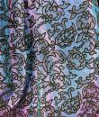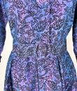 Beautiful cocktail dress in iridescent blue and pink taffeta, flocked with black velvet flowers in a Baroque style, dating from the early 1960s. The taffeta with purple highlights is artificial. Dressmaker's dress with a fitted bodice, wide collar with folded points, three-quarter length buttoned sleeves, and a large button under the bust. The skirt is pleated and lined with unbleached cotton tarlatan, giving it a beautiful puff! Zip on one side and matching buckle belt to cinch the waist (small damage to the silver vinyl lining of the belt). There is a very faint mark at the bottom of the skirt (see last photo), the only flaw to note, the flocked velvet taffeta has retained its original finish and stiffness. No holes. Good overall condition in terms of colour and preservation. Dress can be worn.