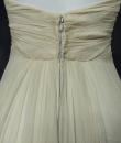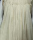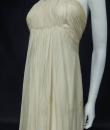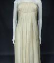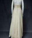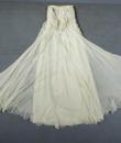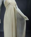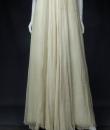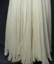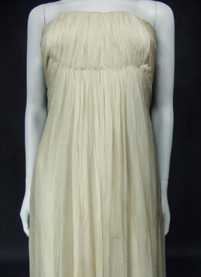Anonymous haute couture evening dress in chiffon and cream silk crepe from the 1970s. Probably from Jean Dessès or Carven designer house(?). An empire-inspired, high-waisted bustier dress with work of pleats at the chest. Beautiful ruffled effect of the skirt with small train and four flounces cut in the bias superimposed on a sheath dress in cream crepe silk. Closure at the back by zip and hook. Haute couture work of the bustier with six integrated underwirings. This dress is entirely sewn by hand. No label. A repair in the bottom of the train on 1 cm, a very slight halo under an armpit, and a yellow aurole of 0.5 cm in the skirt. Otherwise clean dress in very good condition. No other defects to report. Very good condition of color and conservation.