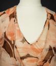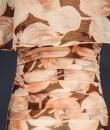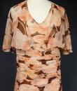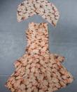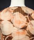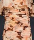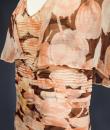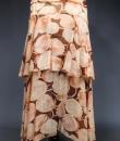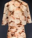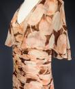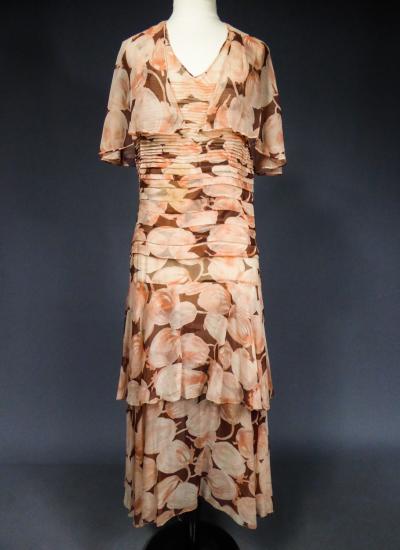 An Anonymous Haute Couture shawl and dress in silk crepe printed with fruit in shades of pink, orange and brown dating from the years 1930/1940. Tubular sleeveless cut typical of the 1930s with a bias work in the ruffles of the skirt. Amazing and clever work of pleats in gradations at the level of the bust and flaring on the low waist. Finely pleated scarf that follows the collar and shoulders. No label but definitely French Haute Couture work. Dress sewn entirely by hand without opening, staple or zipper on the sides as is often the case in the Couture of the 1930s. No underwear but the superposition of the muslin makes opaque. A tiny orange halo on the front very difficult to notice, otherwise very good condition of color and conservation.