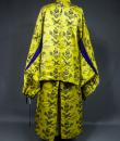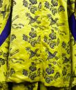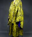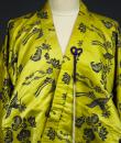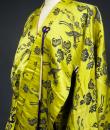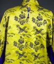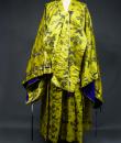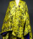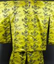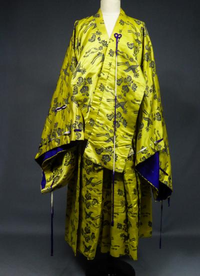 Astonishing chinese Dramatic set in damask satin consisting of a short kimono and a sirwal from the second half of the 20th century. Clever silk damask representing stylized birds and flowers appearing earlier than the cut of the set. Top with Kimono cut adorbed with purple and white trimmings and wide kimono sleeves. Pants with wide sirwal cut closing on the side by two hooks. Lining of the set in purple silk taffeta. No label. Excellent condition of color and conservation.
