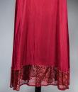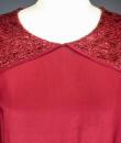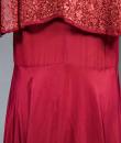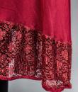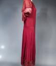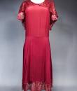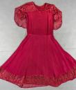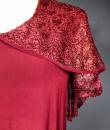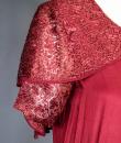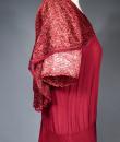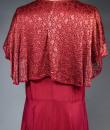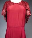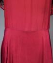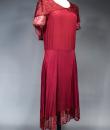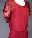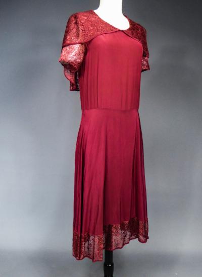 Elegant day dress in wine-red or burgundy silk crepe from the late 1930s. Loose dress with round collar and matching mechanical lace charms. The headcarf shawl collar drapes itself elegantly over the shoulders and back, the sleeves are short and a pleated frill at the bottom of the dress are all in matching burgundy lace. The skirt with small background is finely pleated and sewn at the waist. No closing or opening as is often the case for the dresses of this period. No under-dress. No label. All finishes are Couture and hand-stitched. Very good condition of color and conservation.