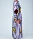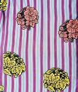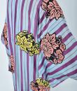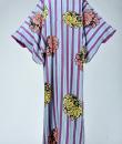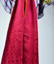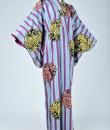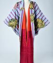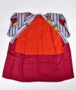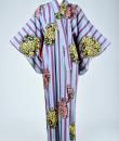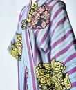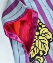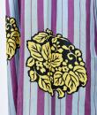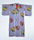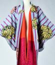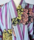 Kimono for evening or indoor use with long sleeves called Furisode and dating from the Art Deco period in Japan. Meisen printed silk crepe with large blue and purple stripes dotted with large yellow, salmon and black floral badges. Red cotton lining and cherry silk damask. 1930's period piece entirely hand sewn. To note some rare and discreet tiny aureoles of less than 0.5 mm. Clean, stable silk and no holes. Very good condition of color and conservation.
