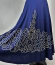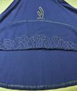 Marinière day dress in navy blue polyamide fabric inspired by the work of the Maison Henri à la Pensée and dating from the late 1940s. Bustier with asymmetrical buttoning, large collar with folded-over points and small raglan sleeves. Buttons with matching fabric underlining the bust at an angle. Corolla skirt with large bottom and side zip. Machine embroidery of applied white soutaches with vermiculated design typical of this period. No lining or markings. No defects to report. Good general condition of colour and conservation.