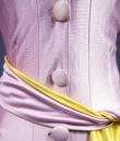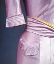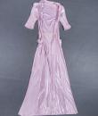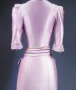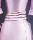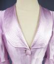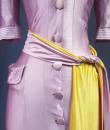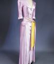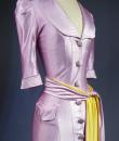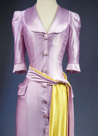 Astonishing indoor or evening coat dress in pink purple and yellow gold synthetic fibranne from the 1940s. Heavy and very fine fabric with an excellent "drop", slightly stretchy and electro-static with a fluted and shiny effect on the front. Frock coat dress with matching buttons in front. Work of topstitching using a sewing machine on the shawl collar, on the shoulders punctuated with foam shoulders pads, on the lapel of the three-quarter sleeves and on the pocket flaps. Skirt with inserts using flares allowing a good size of movement. Matching reversible belt or scarf (?) In golden yellow fibranne on the reverse offering a very daring color palette! Clean dress, little or not worn, as new. Note only 4 to 5 micro holes (1 mm on average on the front and under the left armpit), otherwise excellent condition of color and conservation.