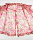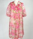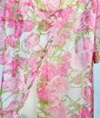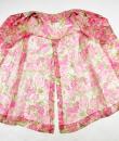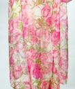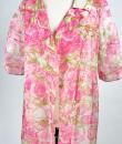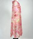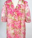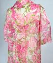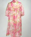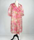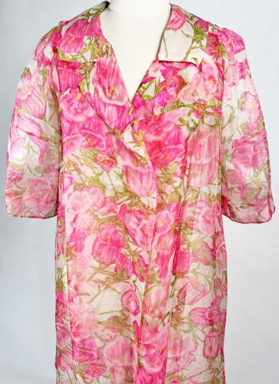 Summer formal coat in printed organza, unlabelled but in the style of Pierre Balmain, dating from the late 1950s. Loose fit, flared at the bottom, slit at the back, three-quarter sleeves, and turned-down collar. Double-breasted coat with no buttons, made of sheer, translucent organza printed in the style of a naturalist painter, typical of textiles from this period. Large pattern with undulating stems laden with bellflowers in shades of pale pink and fuchsia pink. Entirely hand-sewn, probably an unidentified haute couture model, but very much in the style of the House of Pierre Balmain. No defects to report, no stains or holes. Very good color and condition.