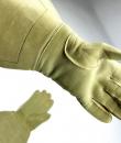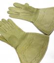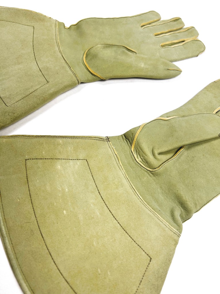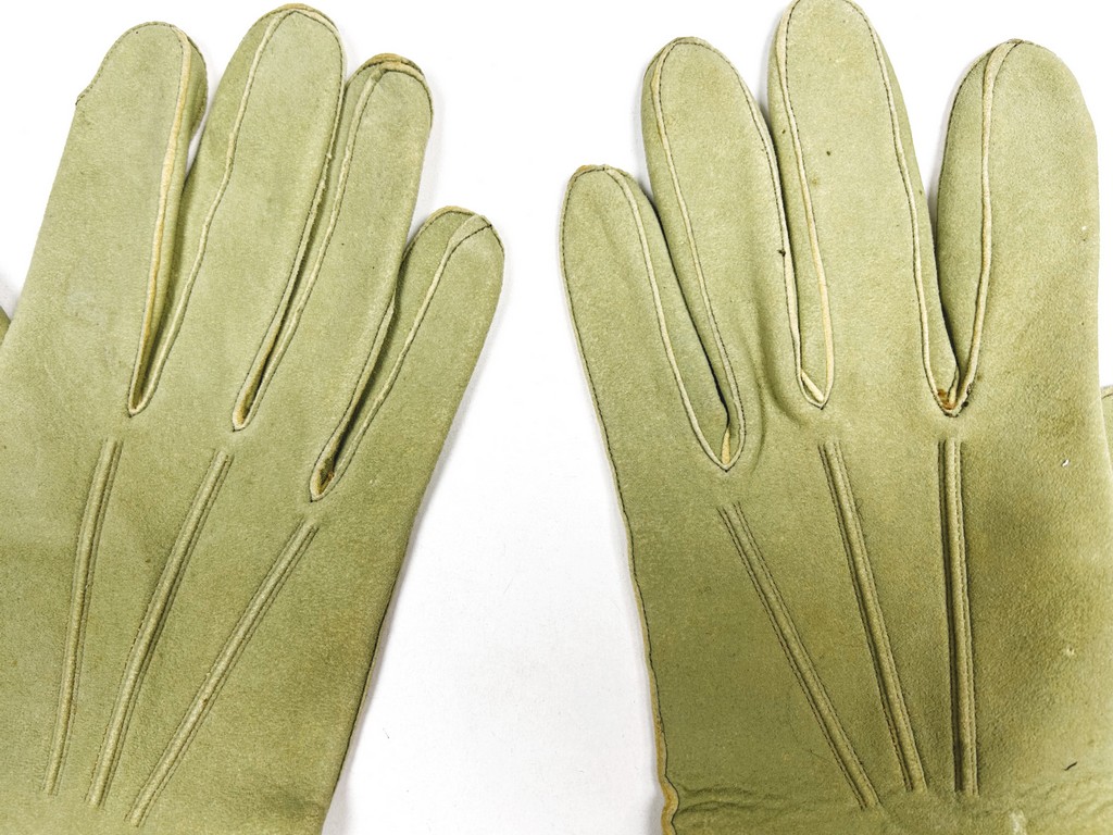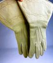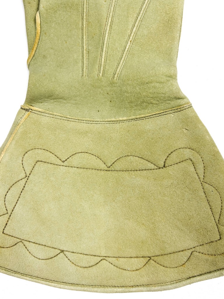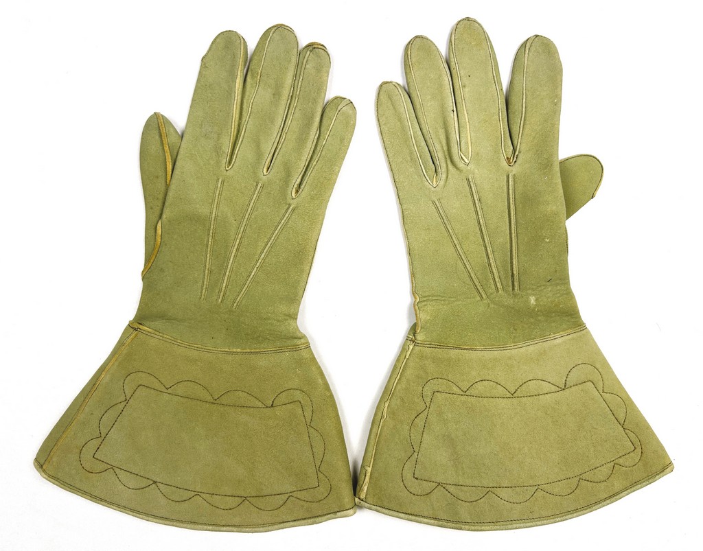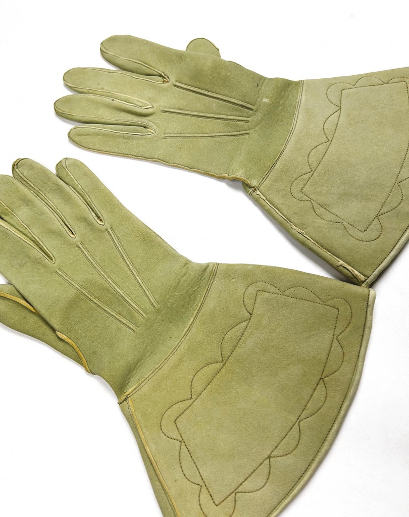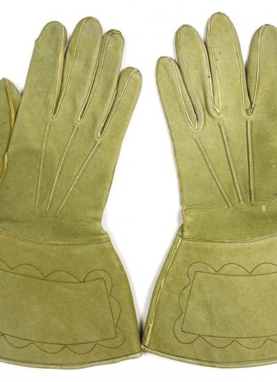 Pair of musketeer gloves in celadon green suede leather - France, dated 1898