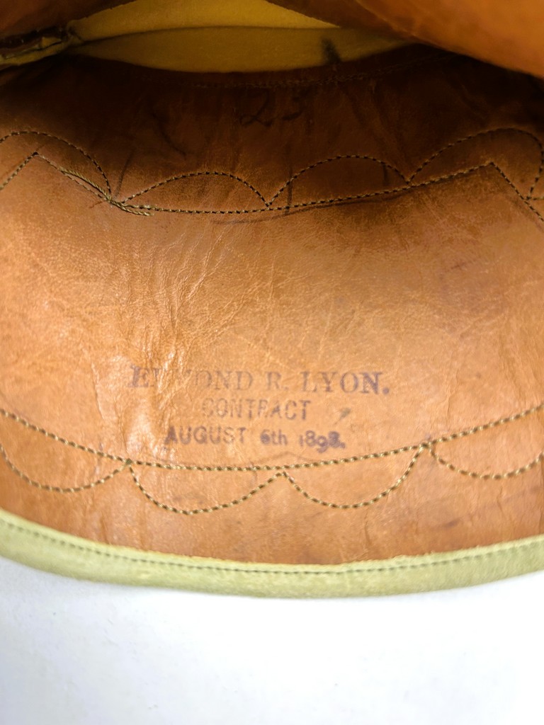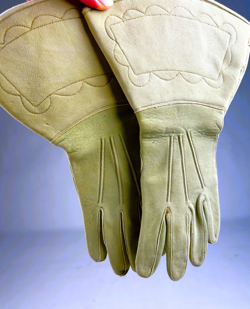 Beautiful and rare pair of musketeer gloves in celadon green suede and danat leather from the late 19th century. Size 33 printed in ink on the inside, along with the stamp of the Edmond R Lyon factory, contract dated 6 August 1898. Wide conical musketeer cuffs, lined with fawn leather for rigidity and topstitched; the assembly remains entirely handcrafted by a French manufacturer, probably for the English or American market. Relatively large for the period, this pair is suitable for a man with slender hands or a woman with normal-sized hands. Very slight period patina to note with four or five tiny rust spots. These gloves remain generally clean, durable and usable without any problems. Good overall condition.