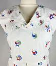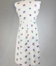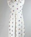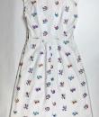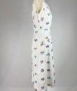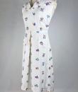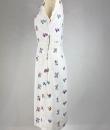 A touching tricolour and patriotic simple dress dating from the Liberation of France after the Second World War in 1944. After several years of scarcity, the dress was often made at home using recycled materials. Here, the back of the dress is made from a white cotton bed sheet. Machine embroidery in a semis of tricoloured flowers, because patriotic colours were all the rage! Simple, sleeveless dress, collar with two turned-down points adorned with two matching buttons. The skirt has a godet on the front for ease and two slanted pockets, with a zip on one side. No lining. Clean dress, no stains or holes. Good condition.