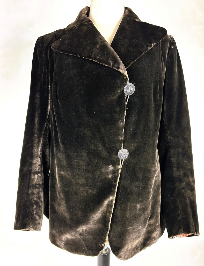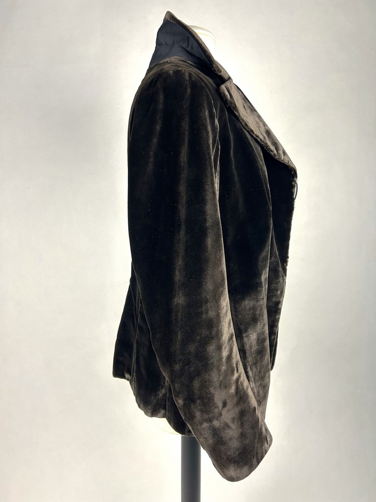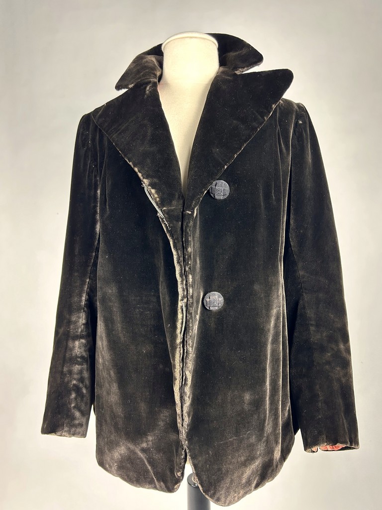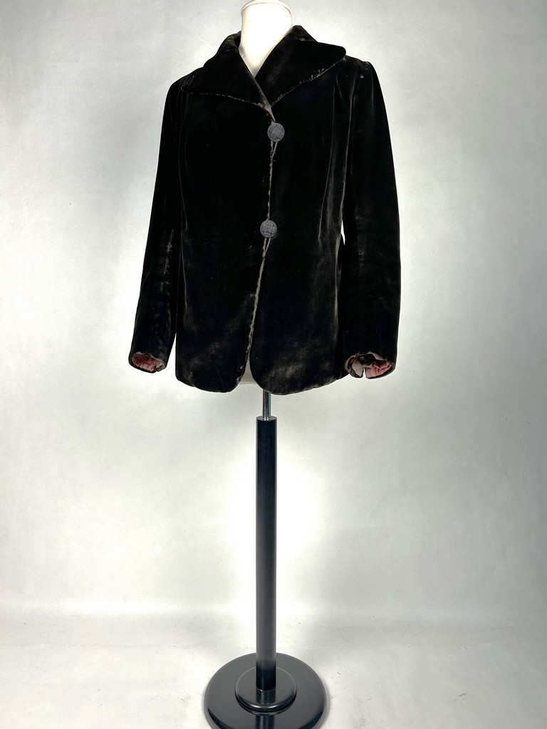 A dark brown plush velvet jacket, imitating fur, dating from the 1930s-1940s. Loose fit, long sleeves, wide folded collar inspired by menswear. This jacket crosses over and fastens at the front with two large buttons with black silk trimmings. Beautifully tailored back with a small slit and basques at the hips. Remarkable Art Deco period lining in artificial silk satin with salmon patterns on silver grey. The brown silk velvet is very dense and of fine quality. No flaws to note apart from a slight patina on the velvet at the seams and repairs to the lining at the armpits. Good overall condition in terms of colour and preservation.