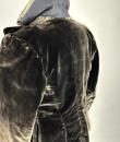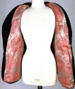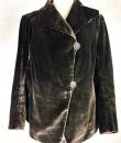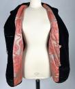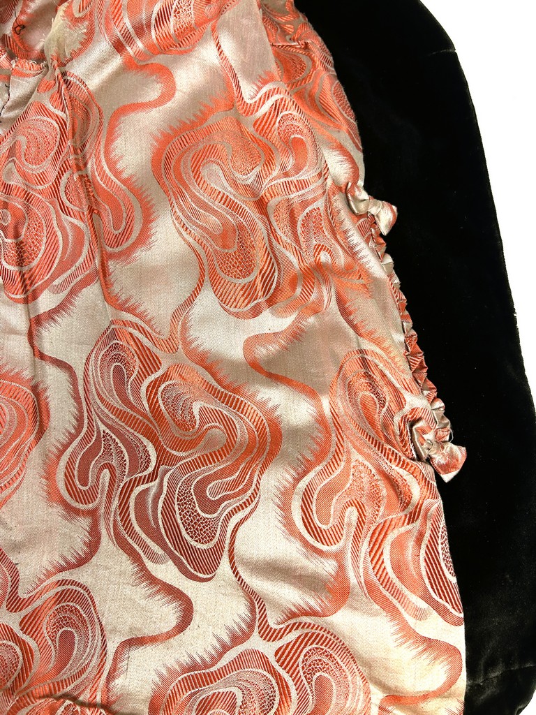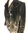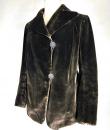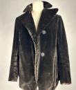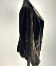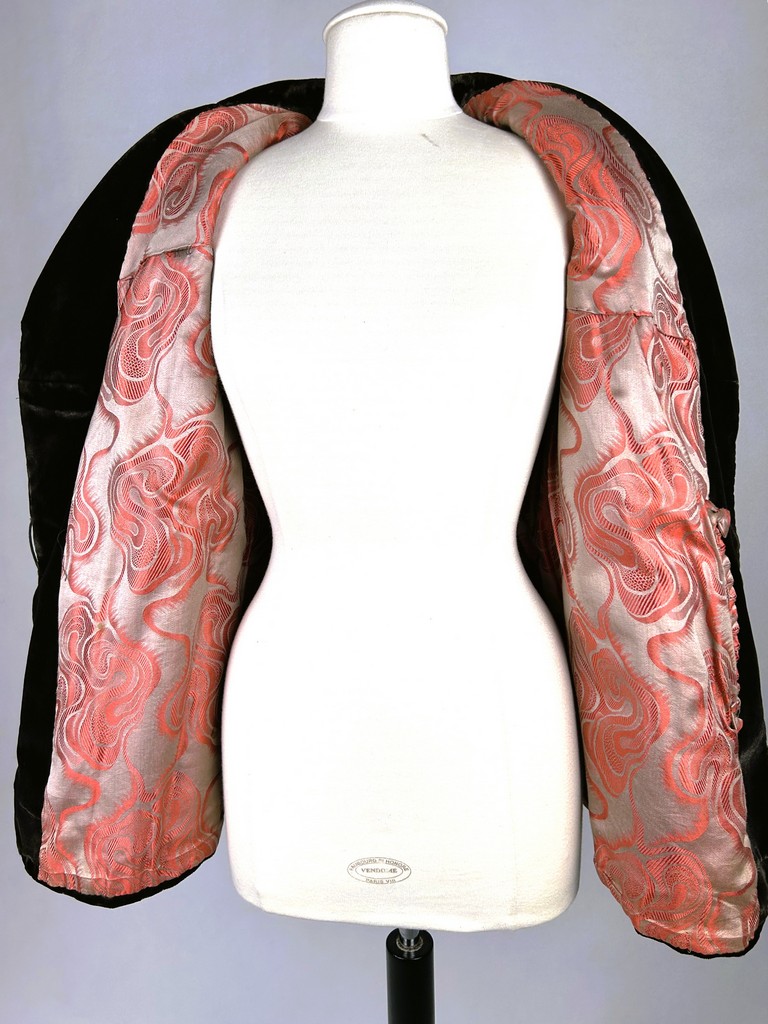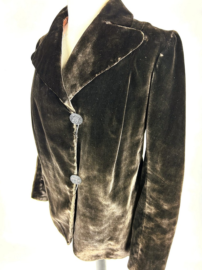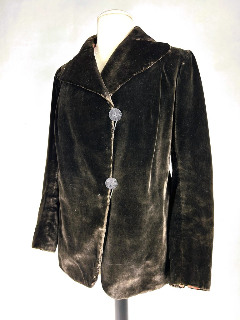 A dark brown plush velvet jacket, imitating fur, dating from the 1930s-1940s. Loose fit, long sleeves, wide folded collar inspired by menswear. This jacket crosses over and fastens at the front with two large buttons with black silk trimmings. Beautifully tailored back with a small slit and basques at the hips. Remarkable Art Deco period lining in artificial silk satin with salmon patterns on silver grey. The brown silk velvet is very dense and of fine quality. No flaws to note apart from a slight patina on the velvet at the seams and repairs to the lining at the armpits. Good overall condition in terms of colour and preservation.