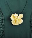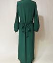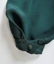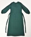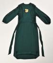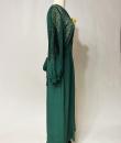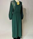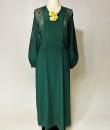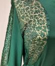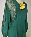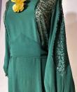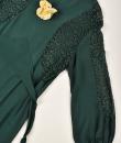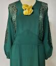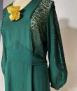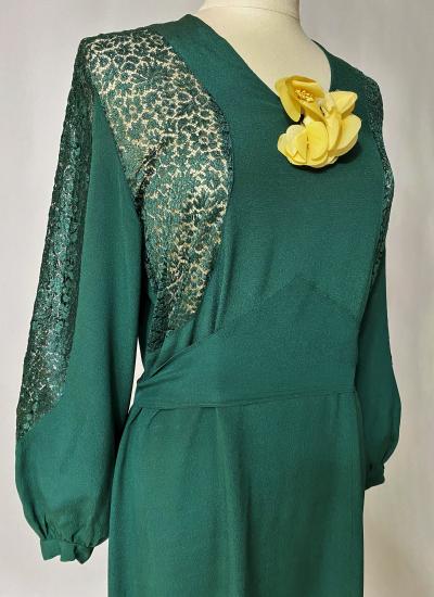 Emerald green crepe evening dress with lace inserts dating from the 1940s. Long dress with puffed sleeves and bib effect. V-shaped applied belt underlines the bustier and is tied behind. Iced cotton flower on the chest (to be reformed). No underdress. Slight fragility at the shoulders at the level of the lace, otherwise clean and without major defects. Good general condition of colour and conservation.