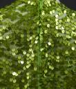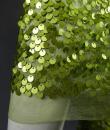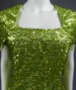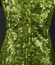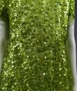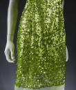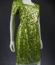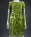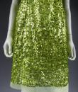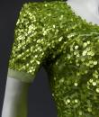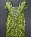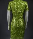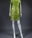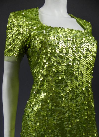 Short dress in green tulle embroidered with iridescent green glitter. Square collar and slin-tight, it closes at the back with a zip. Lining in green synthetic. Very good condition of color and conservation.