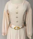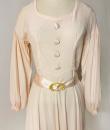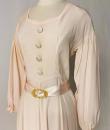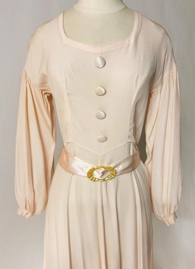 Long dress for evening or ceremony in Fibrane, a reversible matte and satin crepe in artificial fibre, in a subtle powder pink colour, dating from the 1940s. Long puffed sleeves with fine shoulder pleats, square neckline and cut-out effect at the waist. Yellow bakelite buckle waist belt and shiny satin bodice buttons. Snap fastener on one side. To note, a four centimeters stitching near the snaps, otherwise clean and without major defects. Good general condition of colour and conservation.