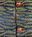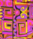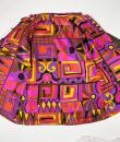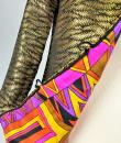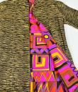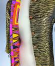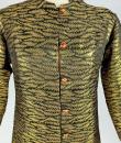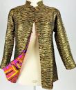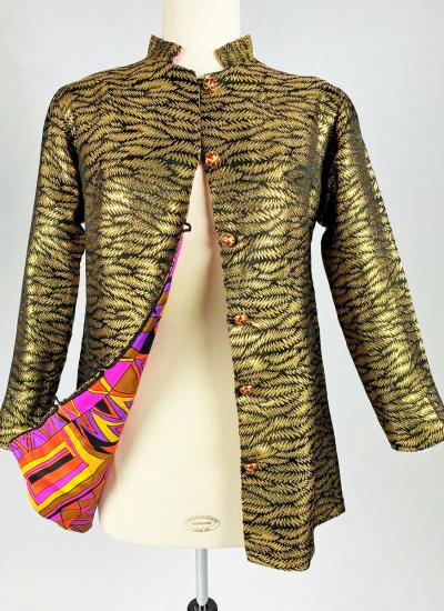 Beautiful jacket in woven gold lamé drawing ferns and psychedelic lining in Modernist printed silk twill with vitamin colours! Straight cut jacket, Mao collar, long sleeves, closed in front by six brass bell buttons varnished in red and gold with baroque motifs. The patterns of the lining are similar to the printed silks used by Lanvin in the same period. Unmarked jacket, probably from a professional sewing workshop, as the hand finishing is very well done. No defects, clean jacket. Very good condition of colour and conservation.