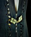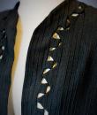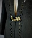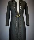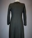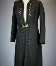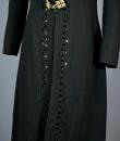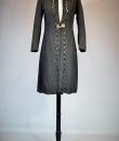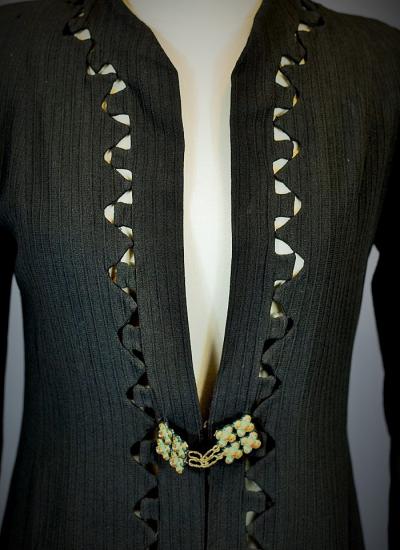 Elegant evening coat in black woollen crepe with geometric and openwork motifs around the edges, signed with the Royal Eagle, a fashion house in Blois. Very fluid coat or dress, long sleeves and front fastening with a patent brass buckle, recalling the 1930s craze for Egyptomania. Lined in black Duchesse satin, this coat has probably been re-dyed in black. No defects. Very good condition of colour and conservation.