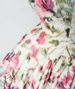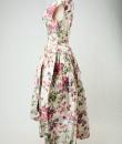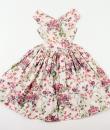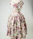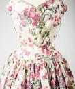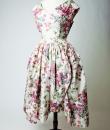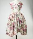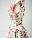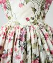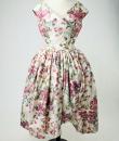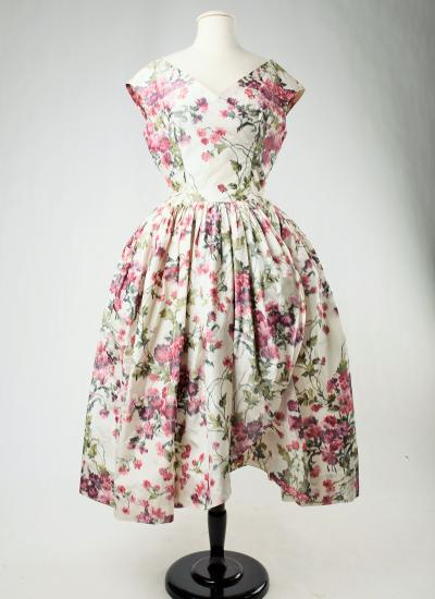 Beautiful summer ball gown in taffeta mottled with large bunches of carnations (?) undulating, without claw and dating from the 1950s. Superb silk taffeta crisp, printed on chain, probably from a manufacture in Lyon. Sleeveless dress, large V-neckline on bustier curved marrying the waist to the haunted silhouette. Wrap skirt with large bottom, mounted with small folds on the hips. Side zipper and unlined. Beautiful hand-sewn finishes. This dress requires a petticoat. No defects. Very nice freshness and good condition.