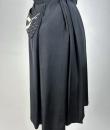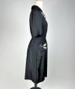 Interesting little black dress with embroidered white ears of wheat, unmarked and dating from the end of the Second World War. Strapless dress in black crepe, with short sleeves and a small collar with turned-down points. Fastened at the front with eleven matching bell buttons with passes (small hole on one button). Appliqué embroidery of white cords forming two large ears of wheat symmetrically arranged on the chest, echoed on the two slanted pockets of the skirt. The skirt is in black silk faille, gathered at the waist and flat pleated at the back. Opening on one side with three press studs. No flaws. Very good colour and condition.