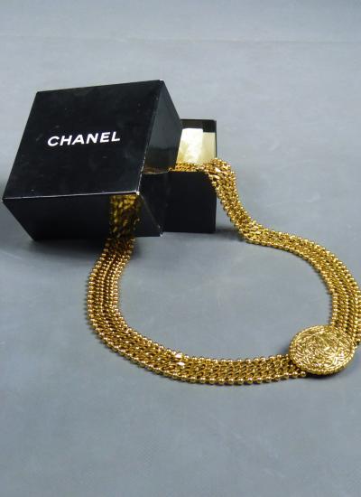 Beautiful evening belt in gilded metal branded by Maison Chanel by the famous designer Robert Goossens and numbered 6020. Labelled C Chanel Made in France on the back of the medallion. Assembly of two stretchable links chains polished on their ends, bordered by chains at shiny golden metal balls. Oval belt buckle in gilded metal chiseled with Renaissance taste motifs with central medallions of a rider on horseback. Hook fastening at the front under the engraved Chanel logo medallion. Original black and white cardboard box with the label of the famous Couture House. Very light patina of use but beautiful state of shine of the gilded metal without gaps or gaps. Excellent condition of color and conservation.