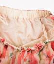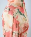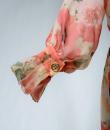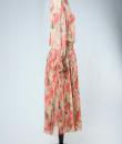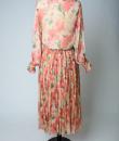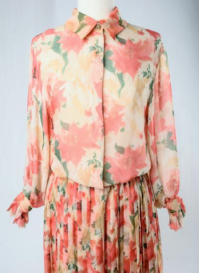 Romantic blouse and skirt set by Christian Dior Boutique under the direction of Marc Bohan and dating from the 1980s. Translucent silk crepe printed with Impressionist floral motifs in shades of pink, salmon, green and sepia on an off-white background. Loose blouse, long sleeves with small puff and pleated cuffs closed with a golden button. Shirt collar punctuated with a golden button and front closure by pearly buttons hidden under a flat pleat. Pleated skirt with side slit and wide elastic waist (slightly relaxed). Cream silk crepe lining for the blouse playing with transparency and straight underskirt in nylon straw. Note slight deformation of the folds of the skirt to reform, otherwise clean, no stains or holes. Good general condition of color and conservation.