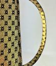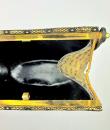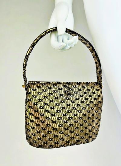Elegant prototype evening handbag by Christian Dior (Attributed to) dating from the 1950s. Rigid bag in black suede printed and stamped in gold with small scale motifs reminiscent of snakeskin. Superb design with rigid oval handles, hinged closure in shiny gold-plated brass and button clasp covered in the same skin. The interior is lined with glossy black leather. There is no Christian Dior label or logo as this is a prototype that was never marketed. This bag was purchased in Paris from Madame Autran, a famous fashion antique dealer in the 1970s, who attested to its provenance. No flaws apart from a very, very slight period patina, including faint micro-scratches to the corners and leather piping, which are very minimal. Beautiful gold colour and good condition.