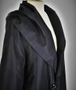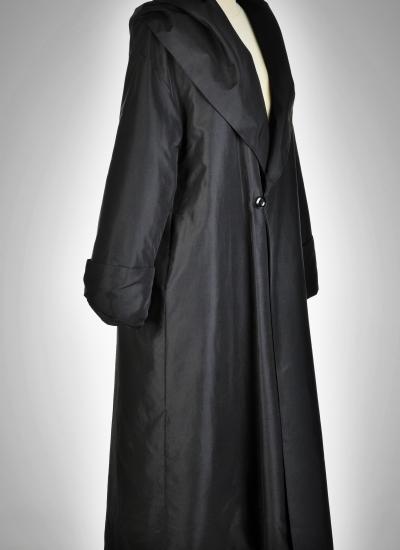 Black taffeta evening kimono coat from the 1950's. The lining and the label were changed in the 1980's, possibly by the Dior (?) workshops. Loose fit and flared with long sleeves and cuffs. Side slit pockets and large shawl collar in the back. Front closure with a black bakelite button. Note two white micro-dirtings (between 1 and 3 mm each) easily cleaned, and a needle hole in one pocket. No other defects, very resistant black taffeta, soft and light. Good general condition of colour and conservation.