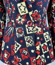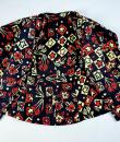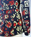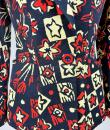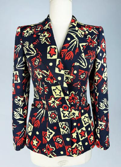 Beautiful fluted silk faille jacket by Christian Lacroix dating from 2000. Fitted, shouldered jacket with fold-down collar and large navy blue and red button fastening at the front and echo at the cuffs. Printed silk ottoman with a navy blue background, flowers and starry lozenges inspired by the sea, which Christian Lacroix used in several of his collections. Navy blue rayon taffeta lining and fuchsia pink label indicating Christian Lacroix Paris Made in France. No damage or wear. Beautiful freshness of colour. Very good condition.
