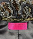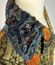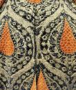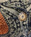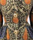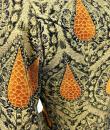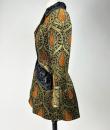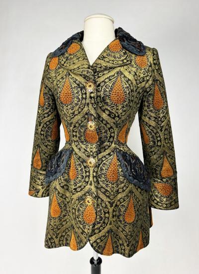 A remarkable frock coat from the golden years of Christian Lacroix Haute Couture. Inspired by Mariano Fortuny, this black silk velvet is finely printed with gold and coral cypress motifs, celebrating the Italian Renaissance or the Ottoman Empire of the 16th century. The slim-fitting, hipped cut is underlined by baroque pocket flaps embroidered with braids of leather, wool and gold canetilles, with an echo at the collar! Four large cloisonné enamel buttons and a glass ruby cabochon close this princely-looking jacket. Musketeer-style cuffs also adorned with four matching buttons. Black satin lining and famous fuchsia label indicating Christian Lacroix Paris, Made in France. No signs of wear or wear, no flaws. Very good colour and condition.