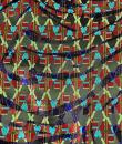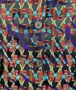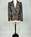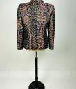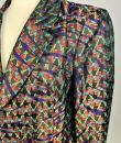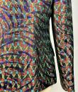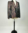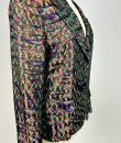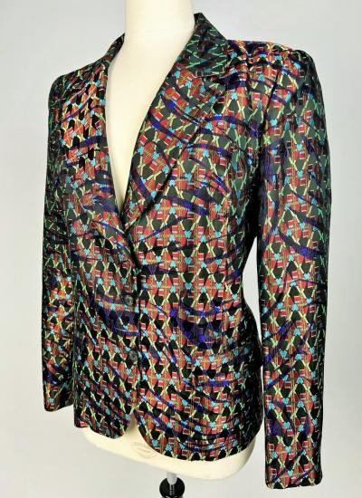 Beautiful jacket in shaped lamé from Christian Lacroix's Bazar collection, dating from 2000. Shouldered, slim-fitting jacket with baroque accents, fold-down collar, two flap pockets and front fastening with three wood-effect buttons. An Art Deco gloss effect for this jacket with interlocking geometric motifs in red, green and blue on a purple and black background. Stunning Art Nouveau lining in rayon taffeta printed with wavy flowers on an apple-green background. Bazar Christian Lacroix Made in France label size 44. No damage or wear. Beautiful freshness of colour. Very good condition.