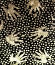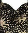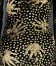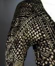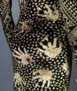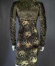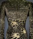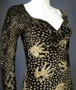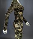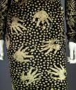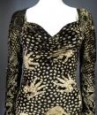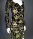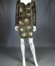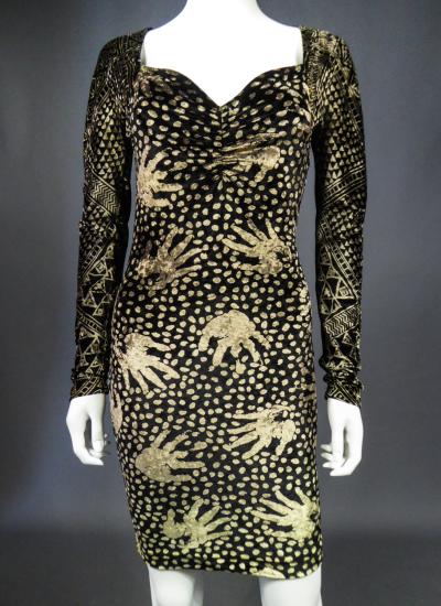 Beautiful skin-tight dress by Christian Lacroix in printed velvet dating from the 1990s. Iridescent stretch elasthane velvet with golden patterns on a black background. Ethnic print with geometric decor and handprints. Large gathered neckline at the chest, long raglan sleeves with yokje highlighting the bust. Without zip or lining. Pink label with black graphics indicating Christian Lacroix Paris. Little or not worn. No signs of wear. Excellent condition of color and conservation.